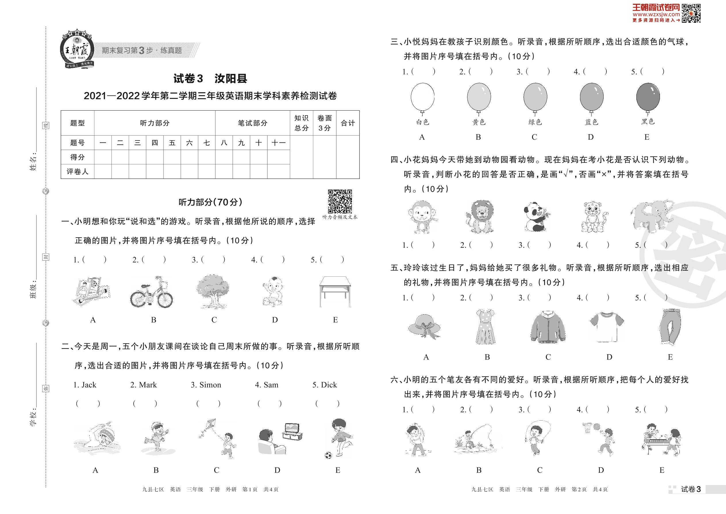 汝阳县2021—2022学年第二学期三年级英语期末学科素养检测试卷(外研版)【3】
