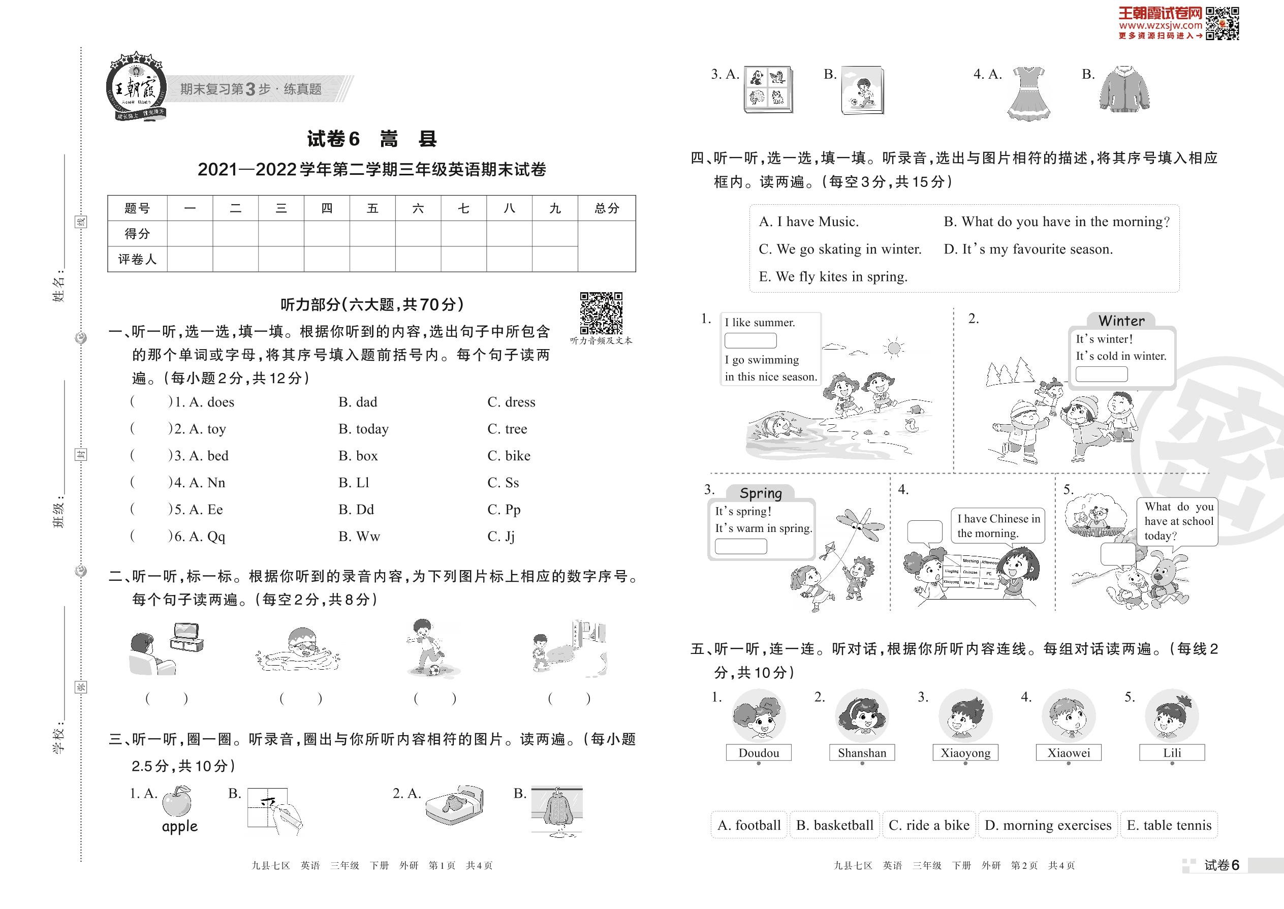 嵩县2021—2022学年第二学期三年级英语期末考试试卷(外研版)【6】