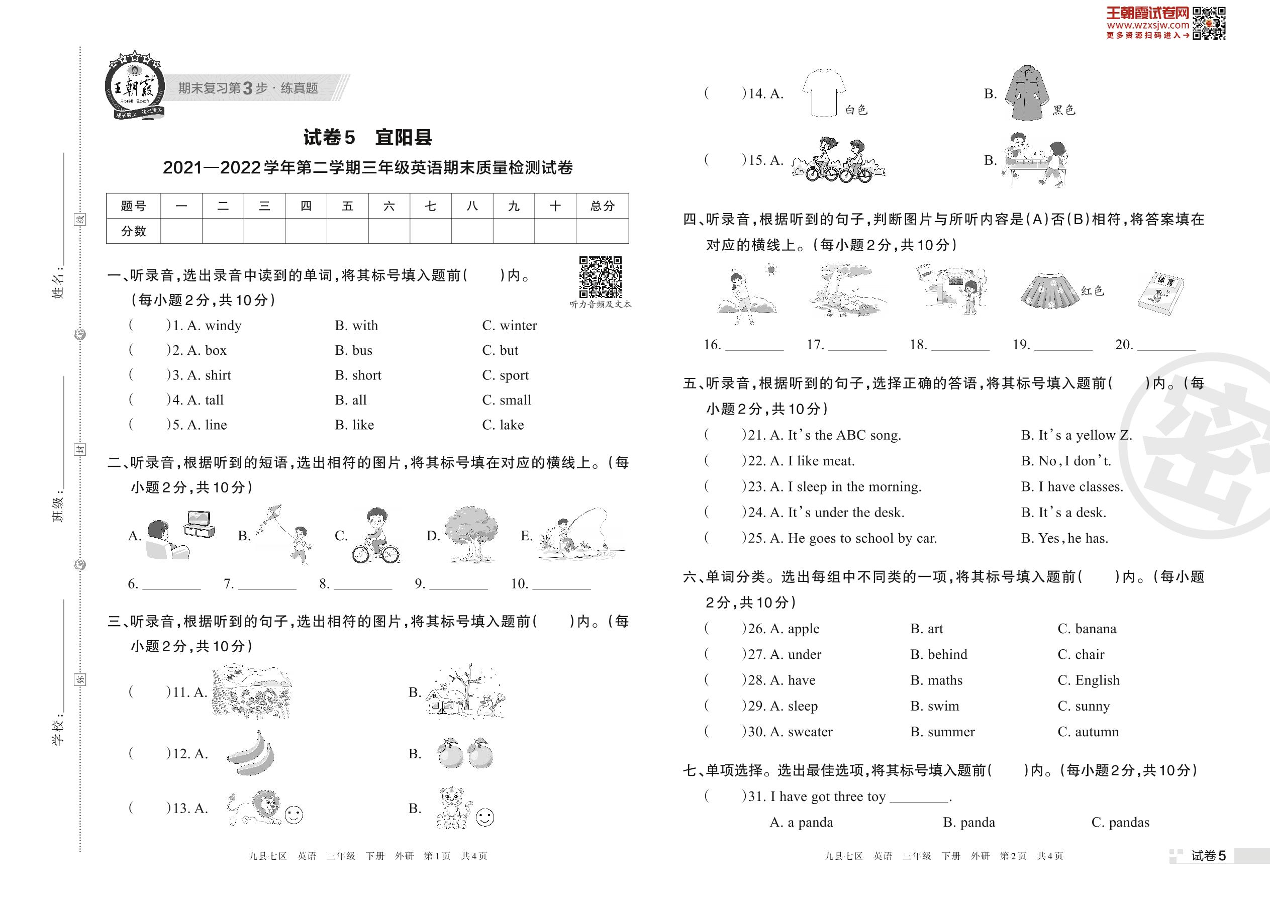 宜阳县2021—2022学年第二学期三年级英语期末质量检测试卷(外研版)【5】