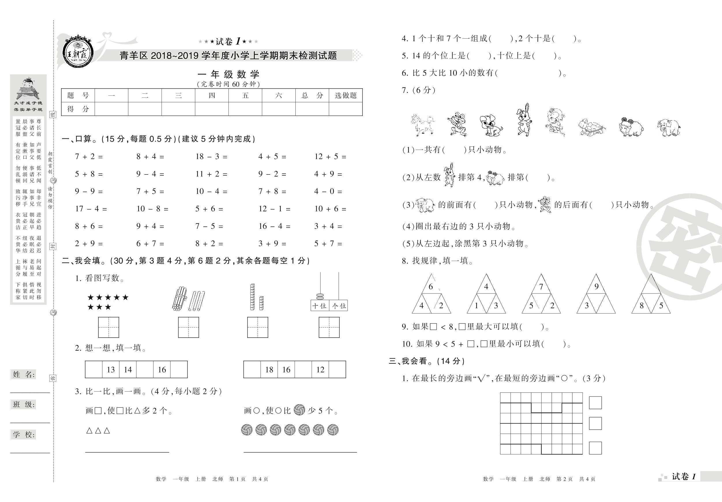 2018-2019学年第一学期成都市青羊区一年级数学试卷(北师版)【1】