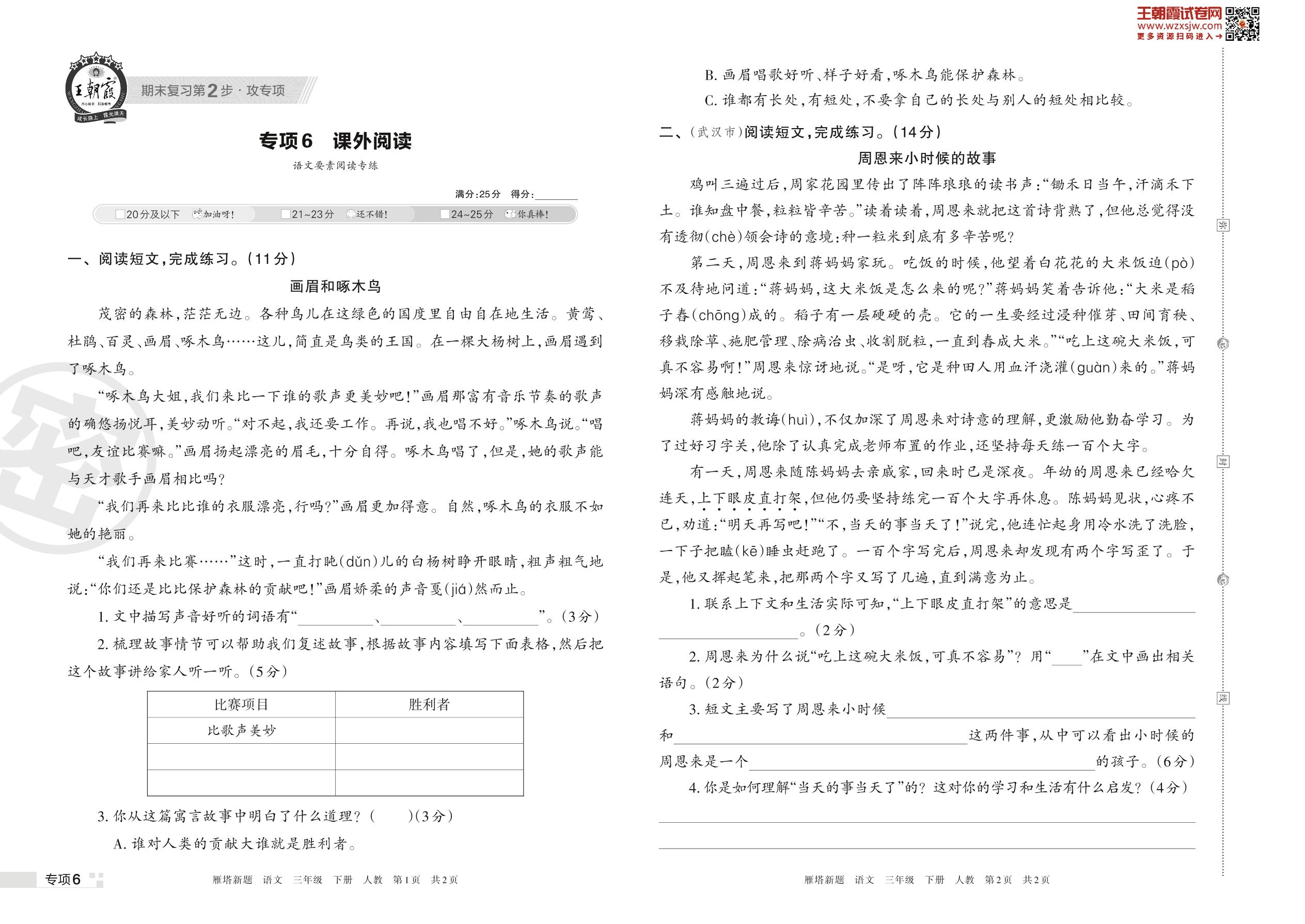 王朝霞期末专项卷——课外阅读三年级下册语文(人教版)_R230425141731755【6】