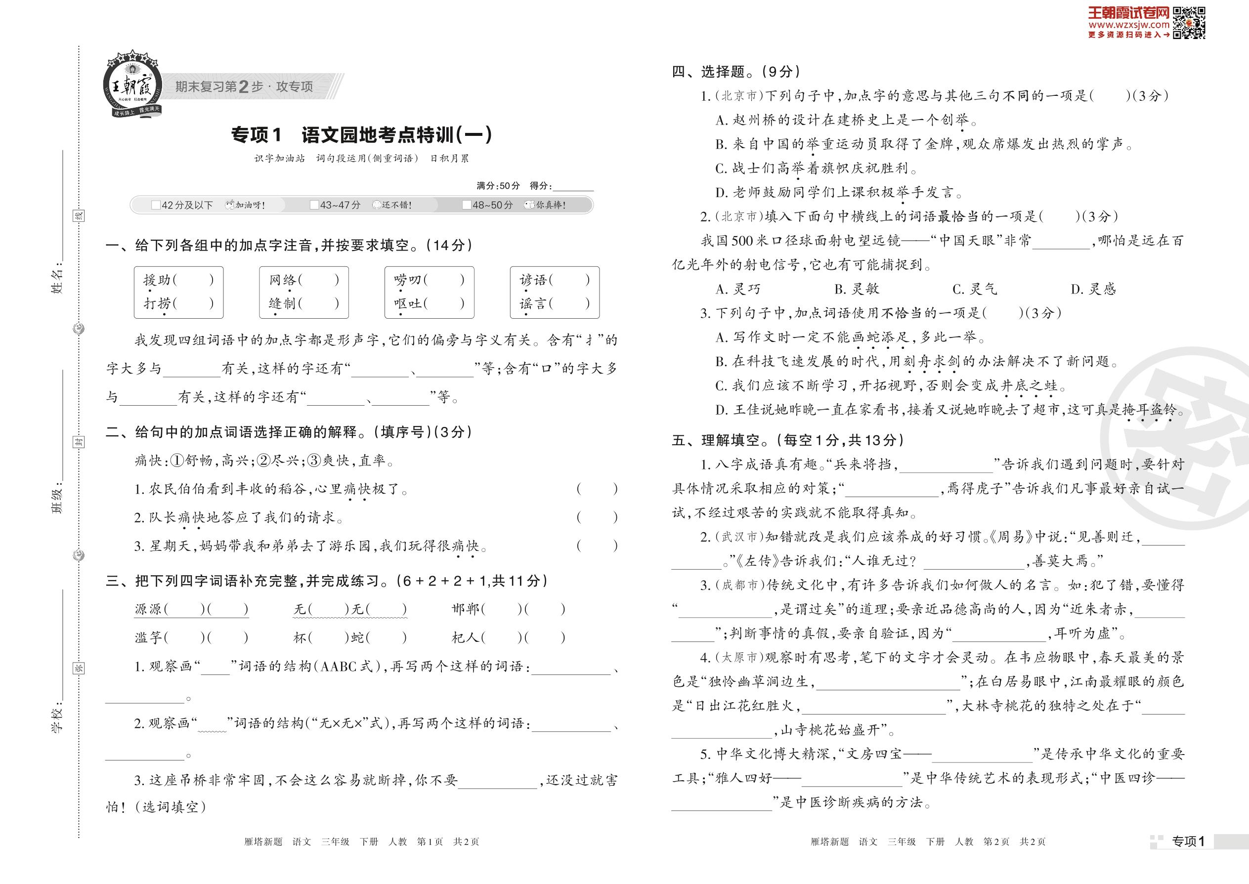 王朝霞期末专项卷——语文园地考点特训(一)三年级下册语文(人教版)_R230425141732920【1】