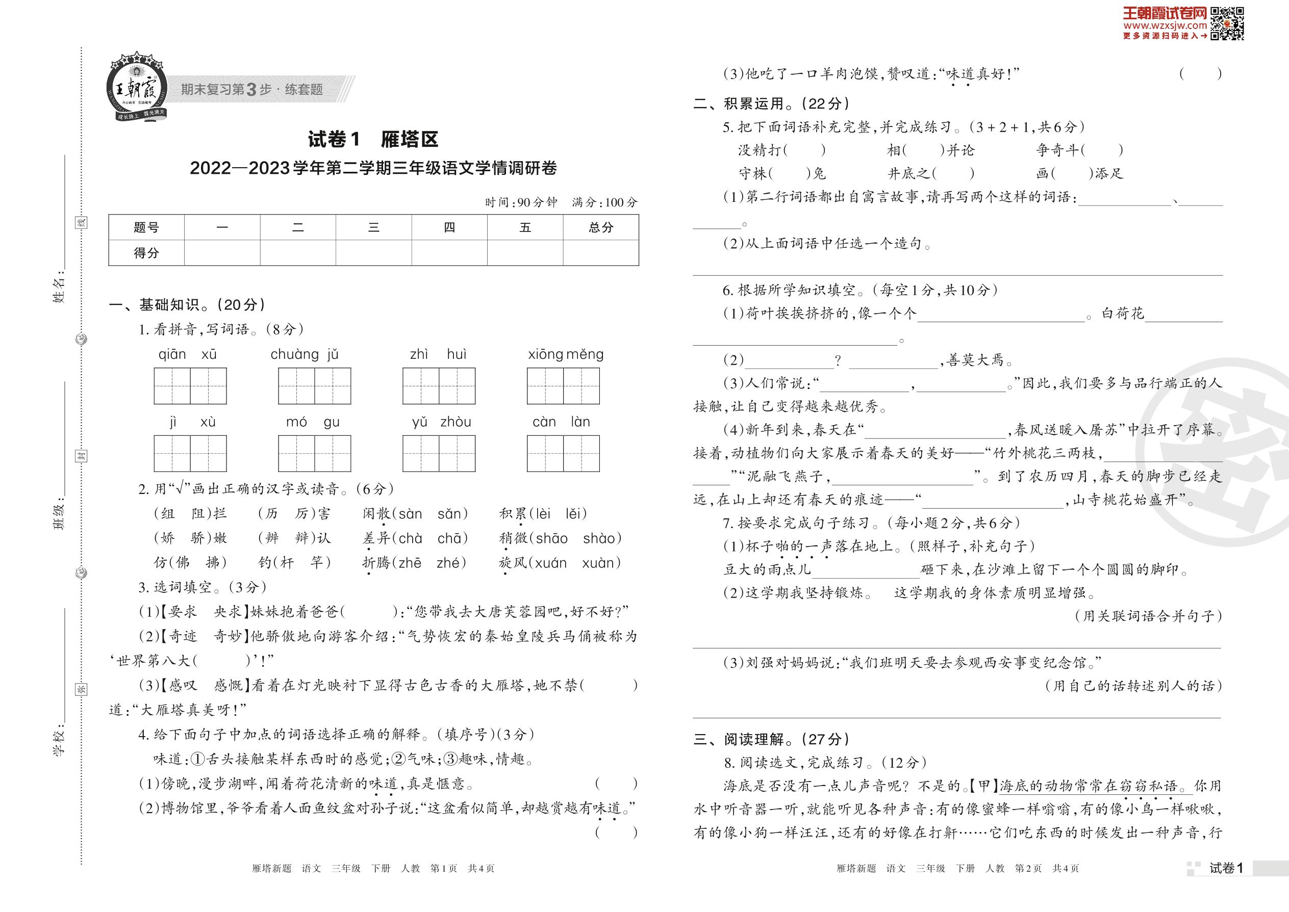 雁塔区2022—2023学年第二学期三年级语文学情调研卷(人教版)【1】