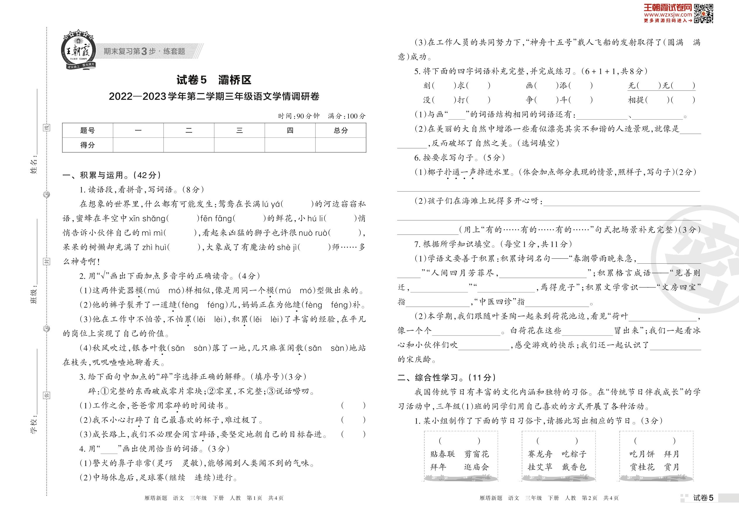 灞桥区2022—2023学年第二学期三年级语文学情调研卷(人教版)【5】