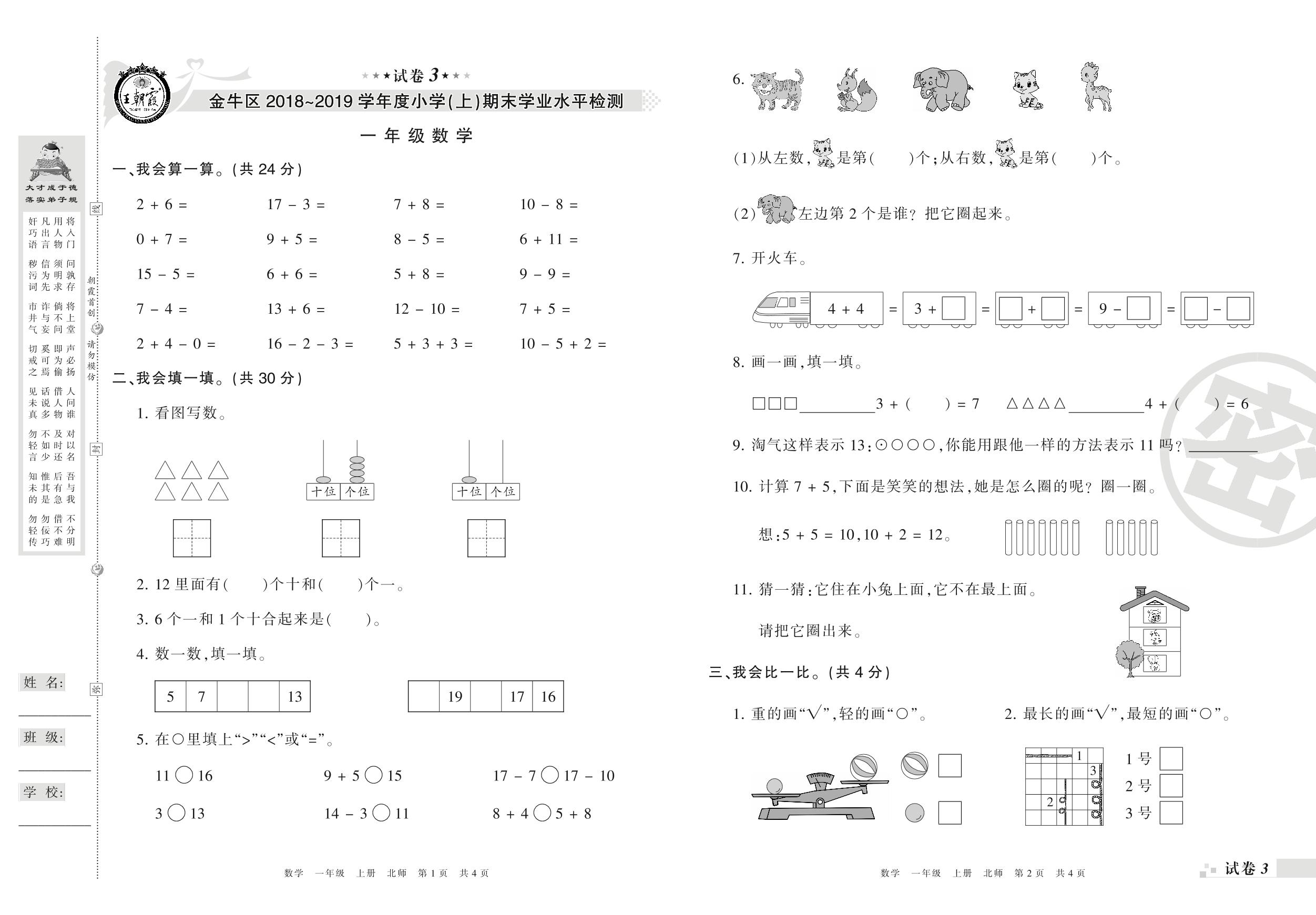 2018-2019学年第一学期成都市金牛区一年级数学试卷(北师版)【3】