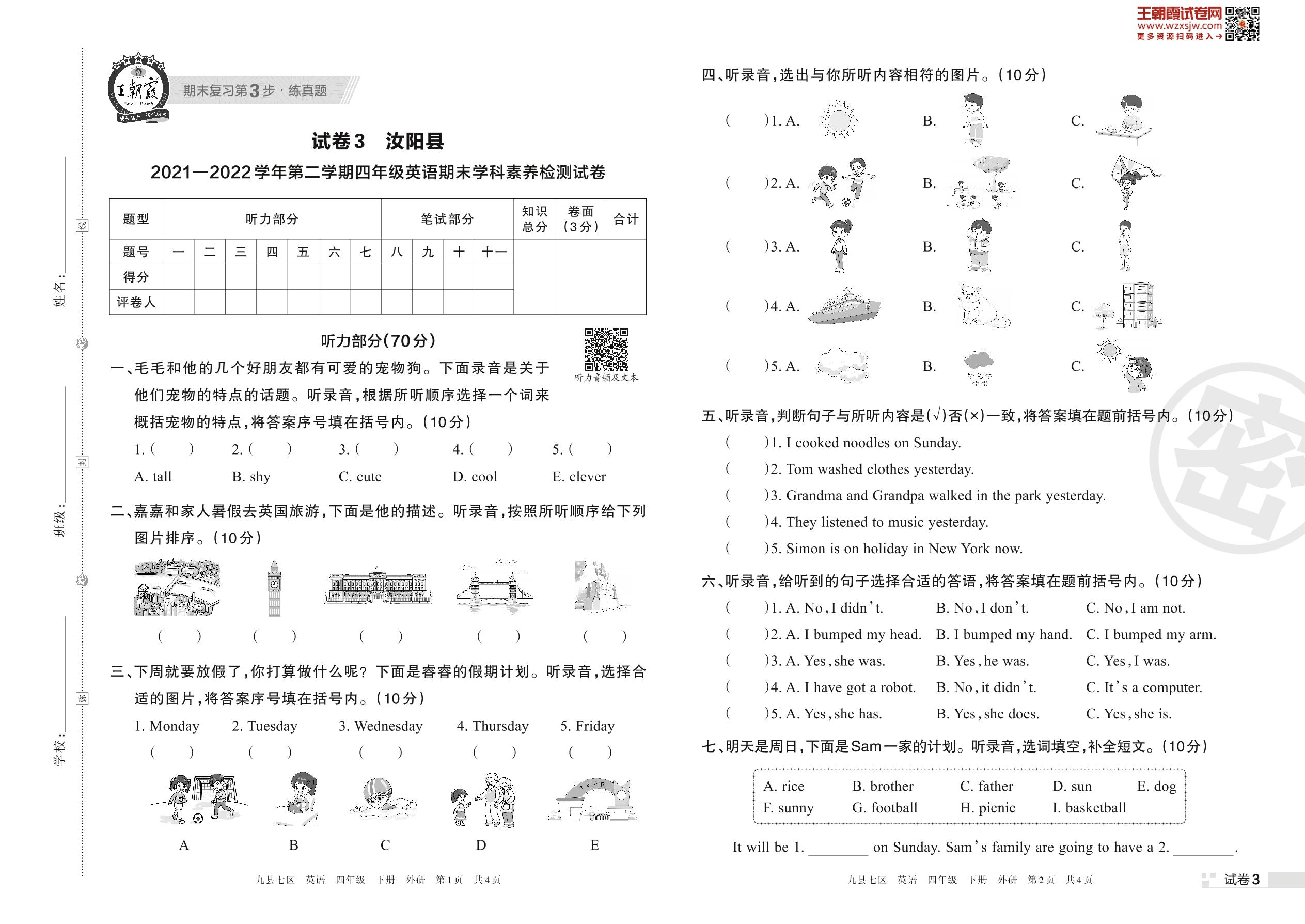汝阳县2021—2022学年第二学期四年级英语期末学科素养检测试卷(外研版)【3】