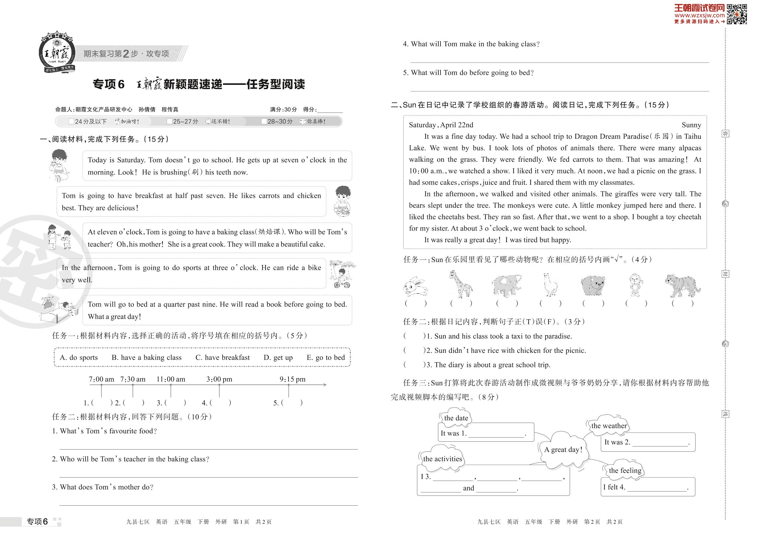 王朝霞期末专项卷——王朝霞新颖题速递:任务型阅读五年级下册英语(外研版)【6】