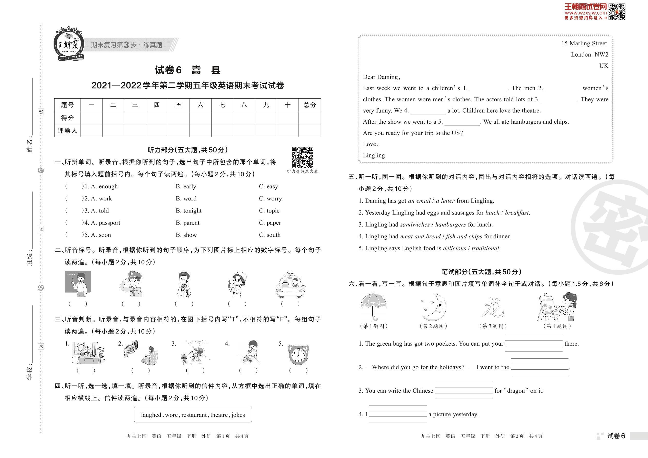 嵩县2021—2022学年第二学期五年级英语期末考试试卷(外研版)【6】