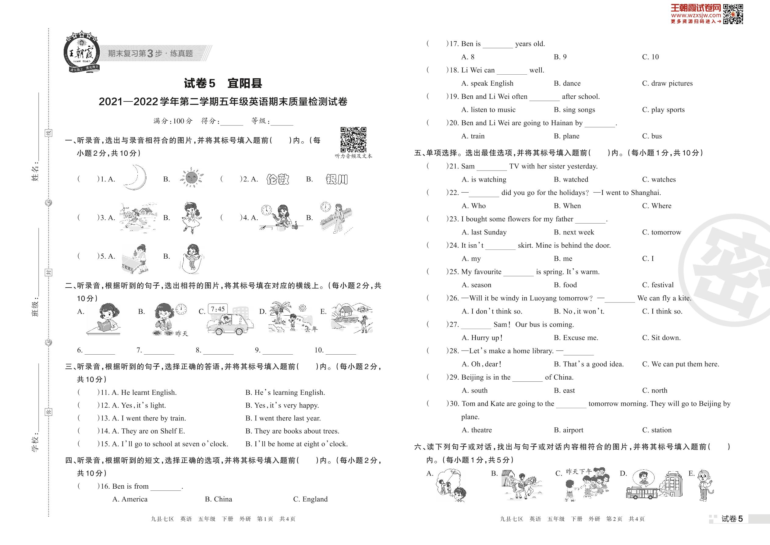 宜阳县2021—2022学年第二学期五年级英语期末质量检测试卷(外研版)【5】