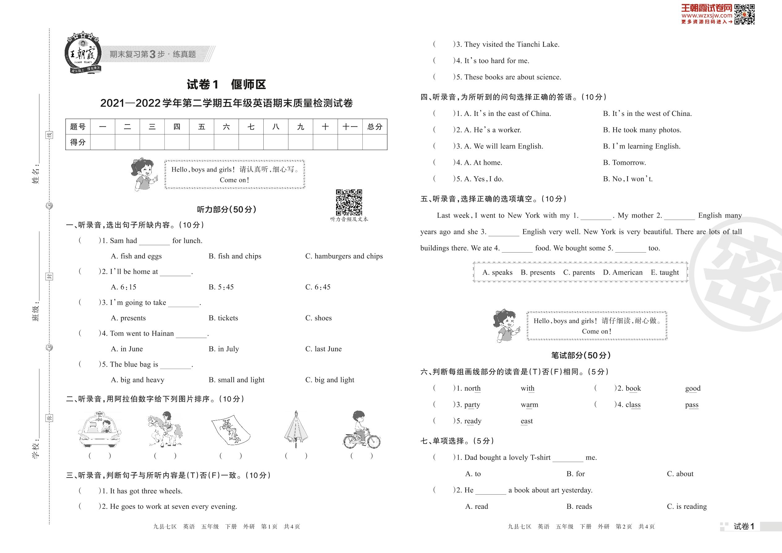 偃师区2021—2022学年第二学期五年级英语期末质量检测试卷(外研版)【1】