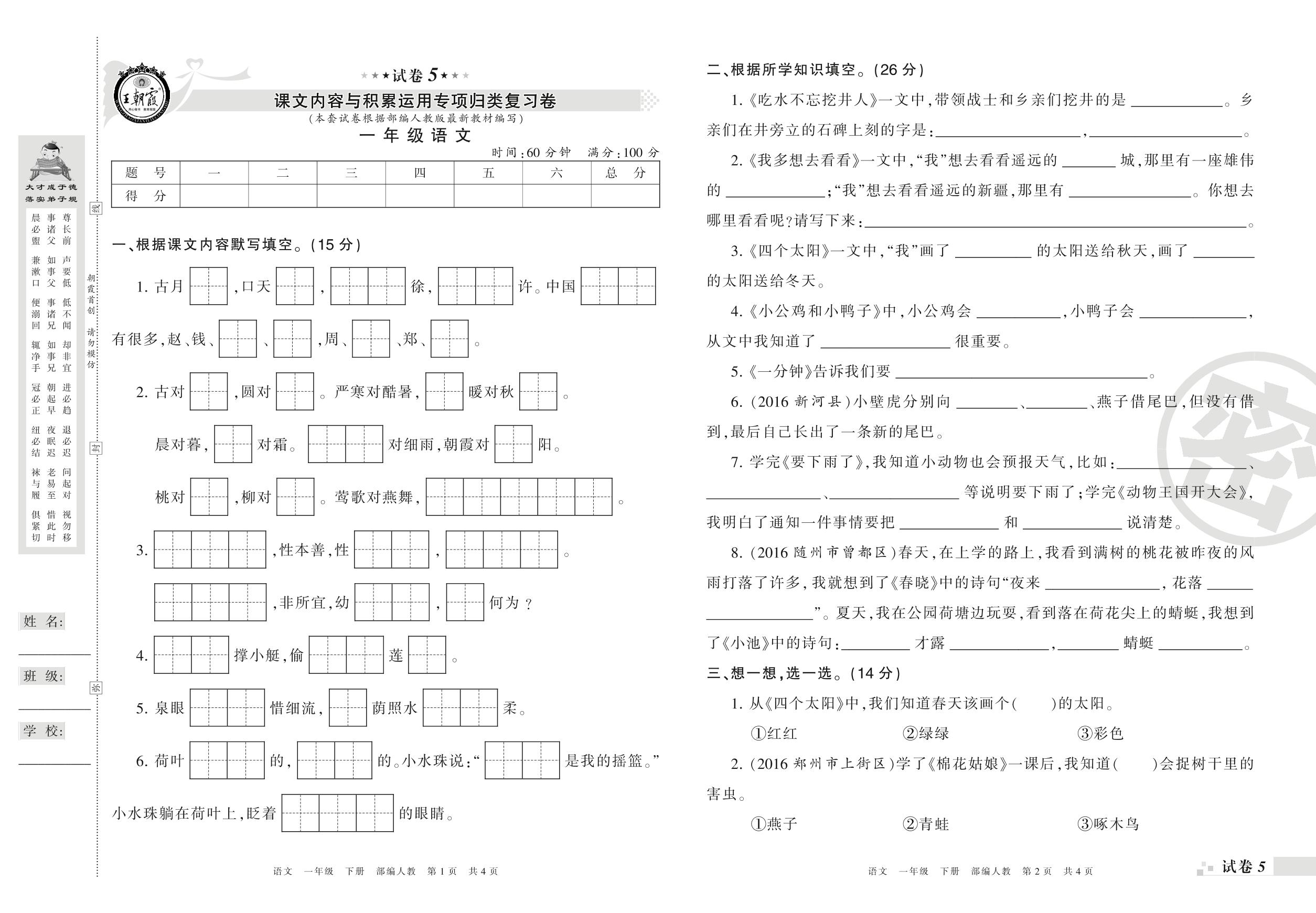 王朝霞期末专项卷——课文内容与积累运用专项归类复习卷一年级下册语文(人教版)_R210731190644【5】