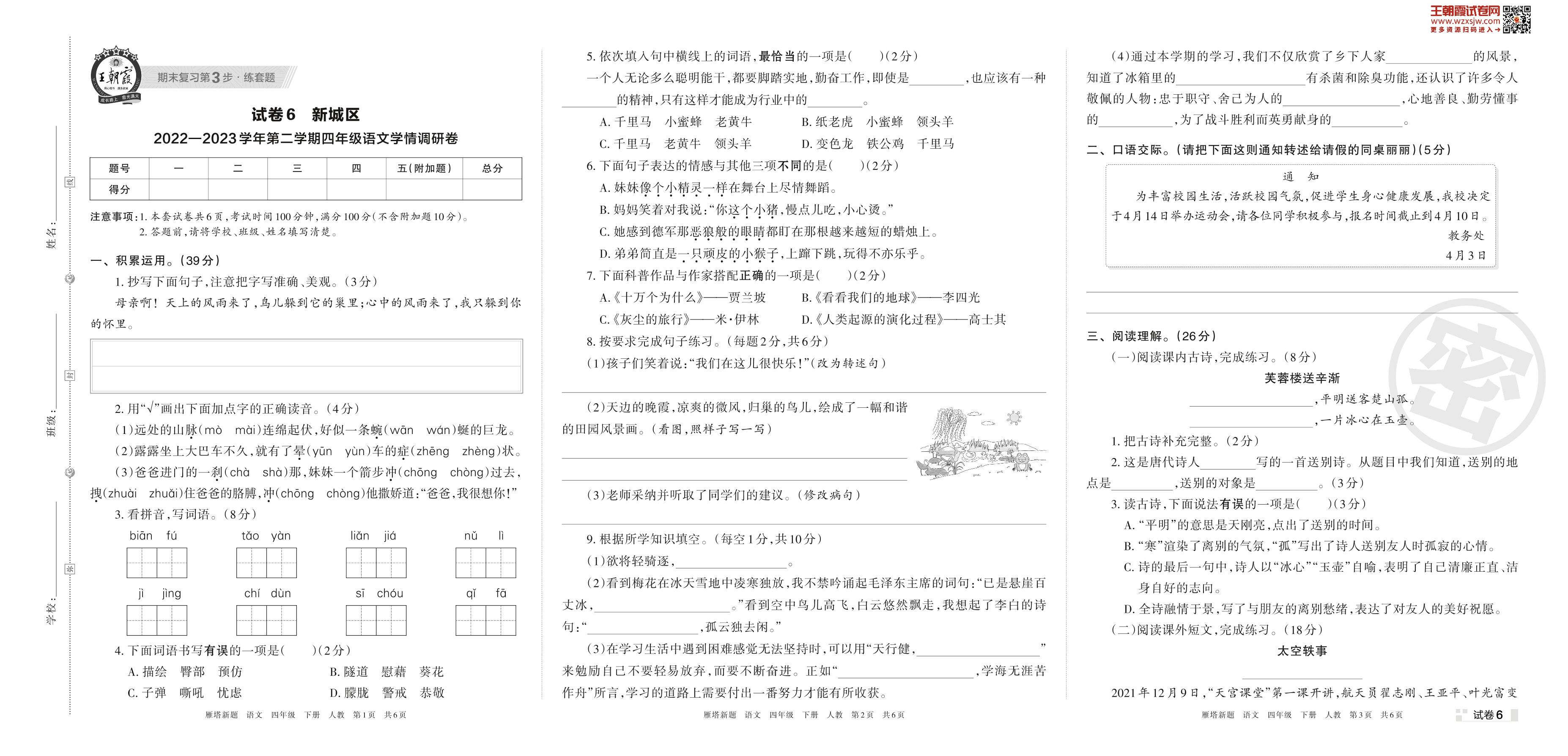 新城区2022—2023学年第二学期四年级语文学情调研卷(人教版)【6】