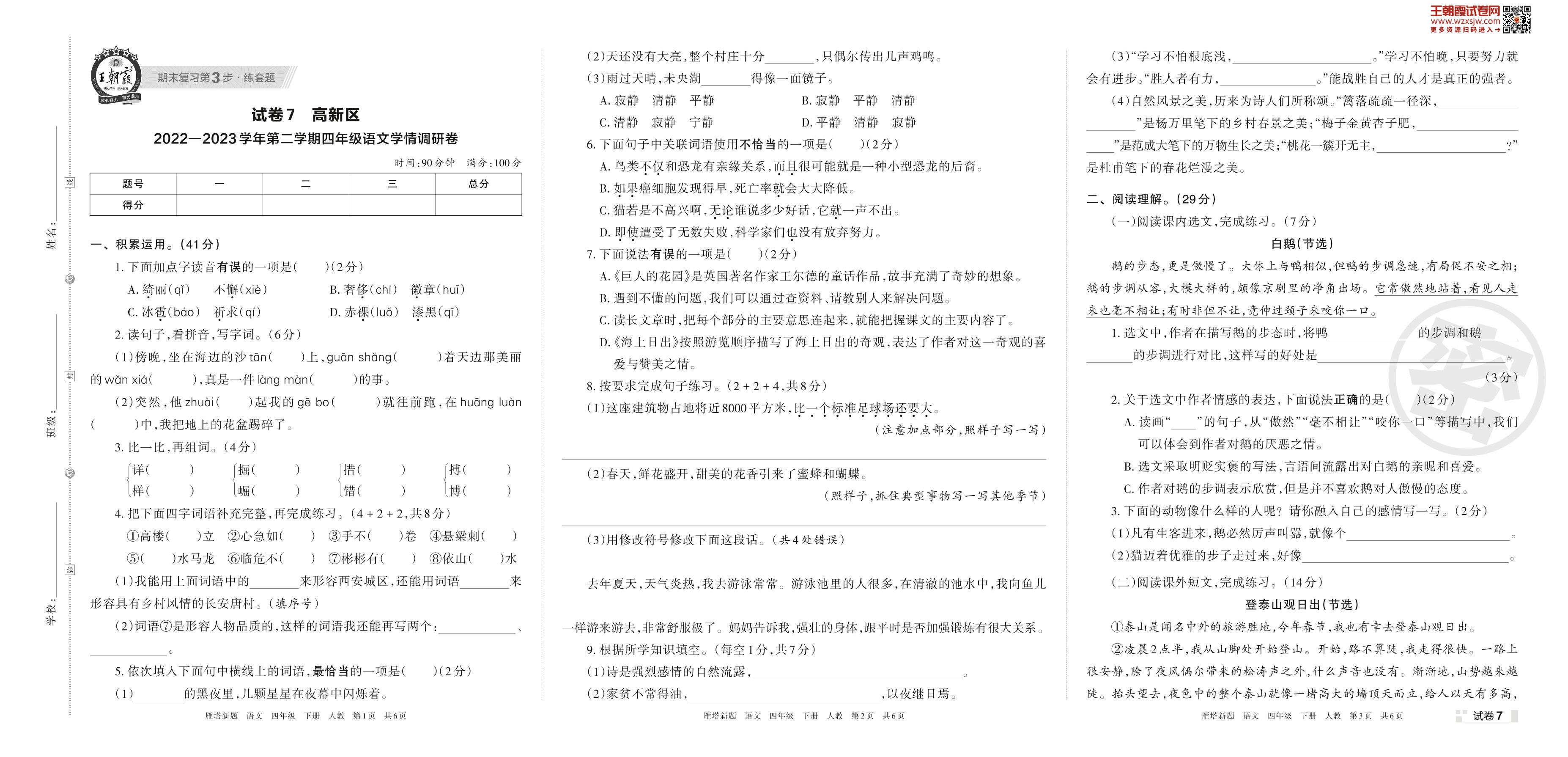 高新区2022—2023学年第二学期四年级语文学情调研卷(人教版)【7】