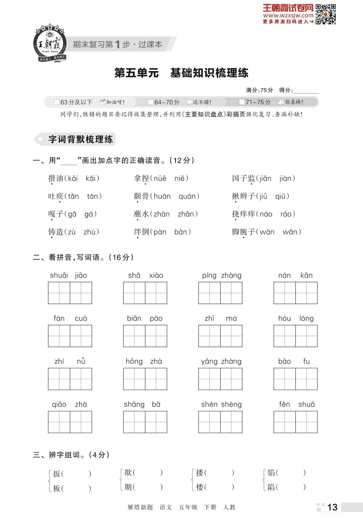 王朝霞期末过课本——第五单元 基础知识梳理练五年级下册语文(人教版)_R230425144557026