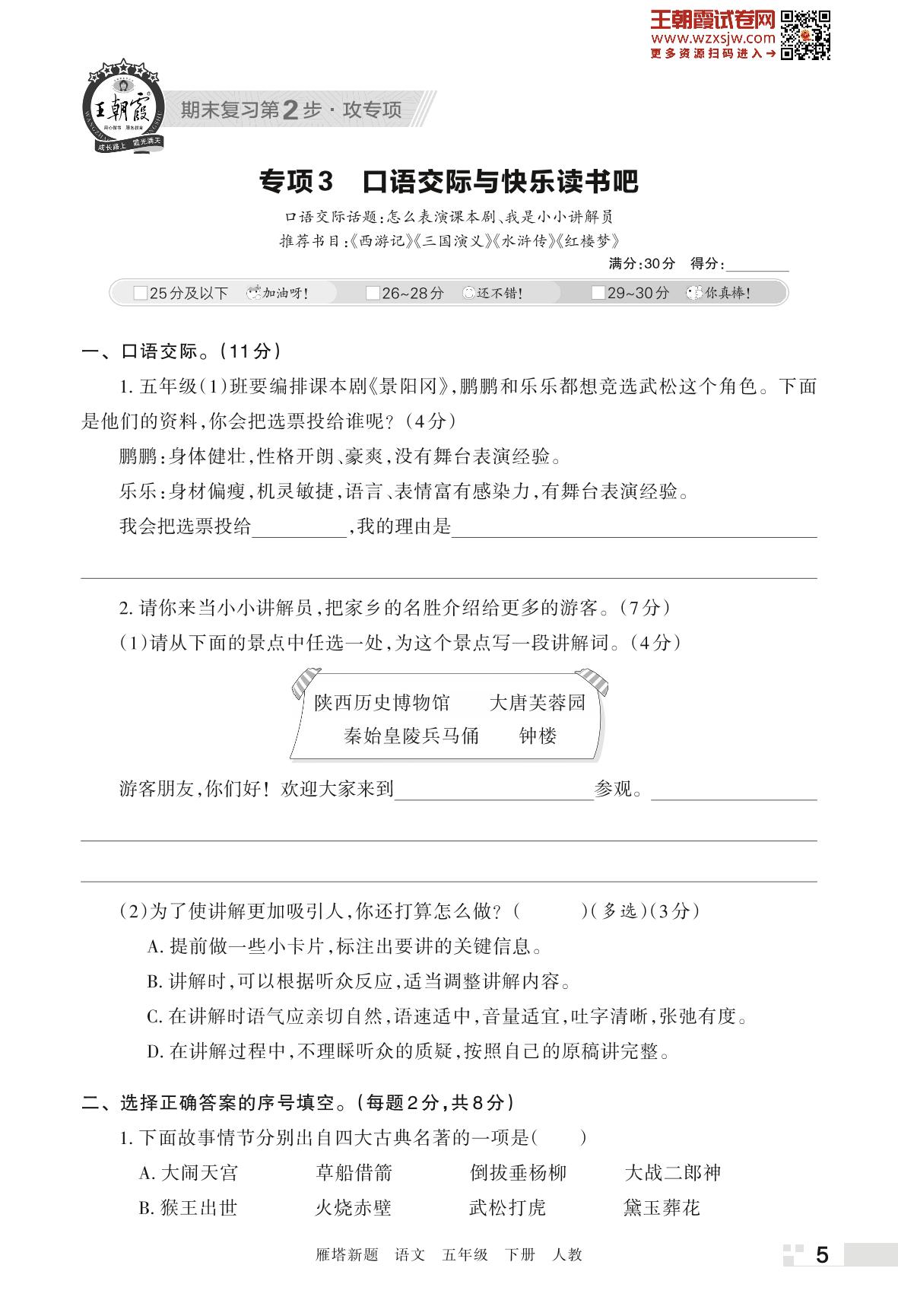 王朝霞期末专项卷——口语交际与快乐读书吧五年级下册语文(人教版)【3】