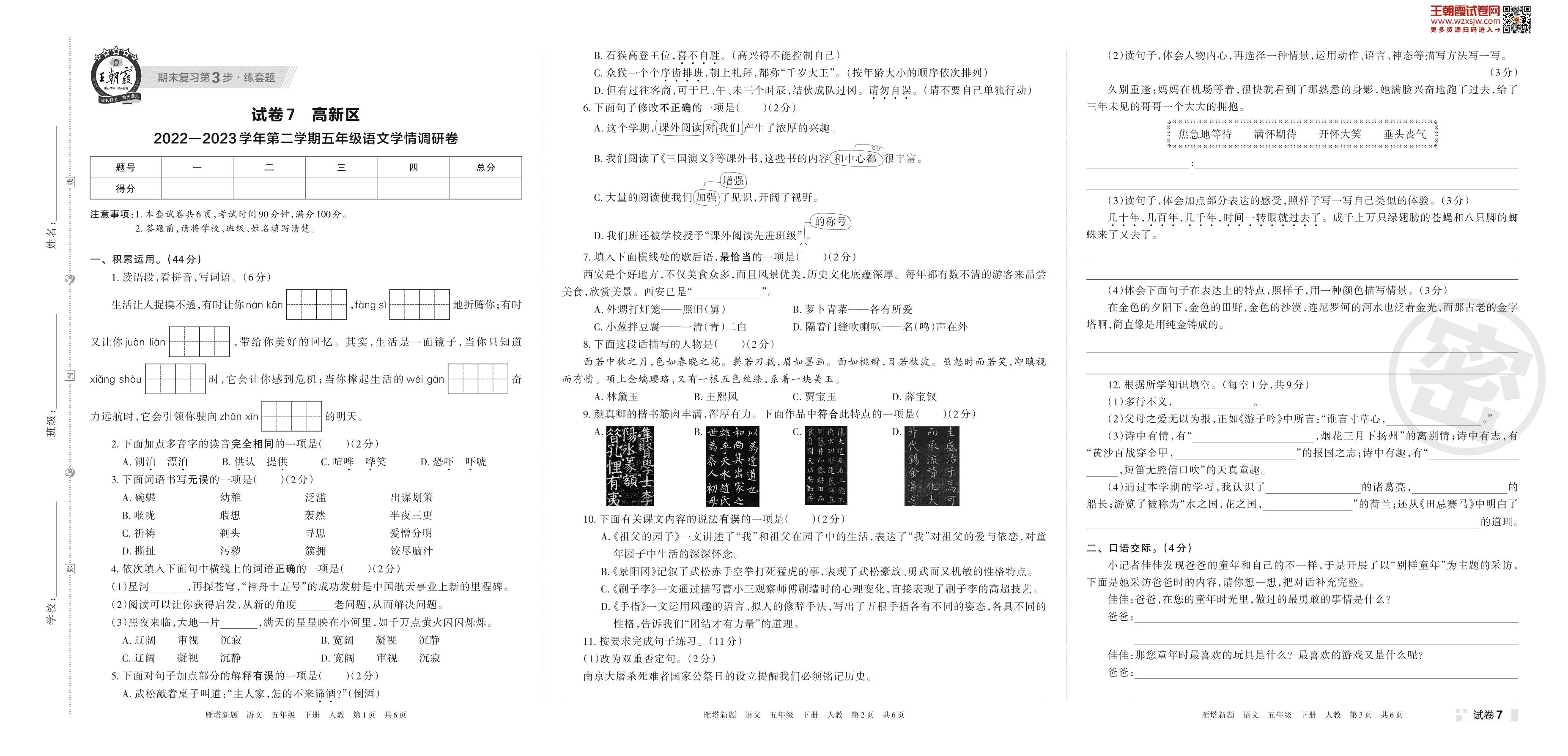 高新区2022—2023学年第二学期五年级语文学情调研卷(人教版)【7】