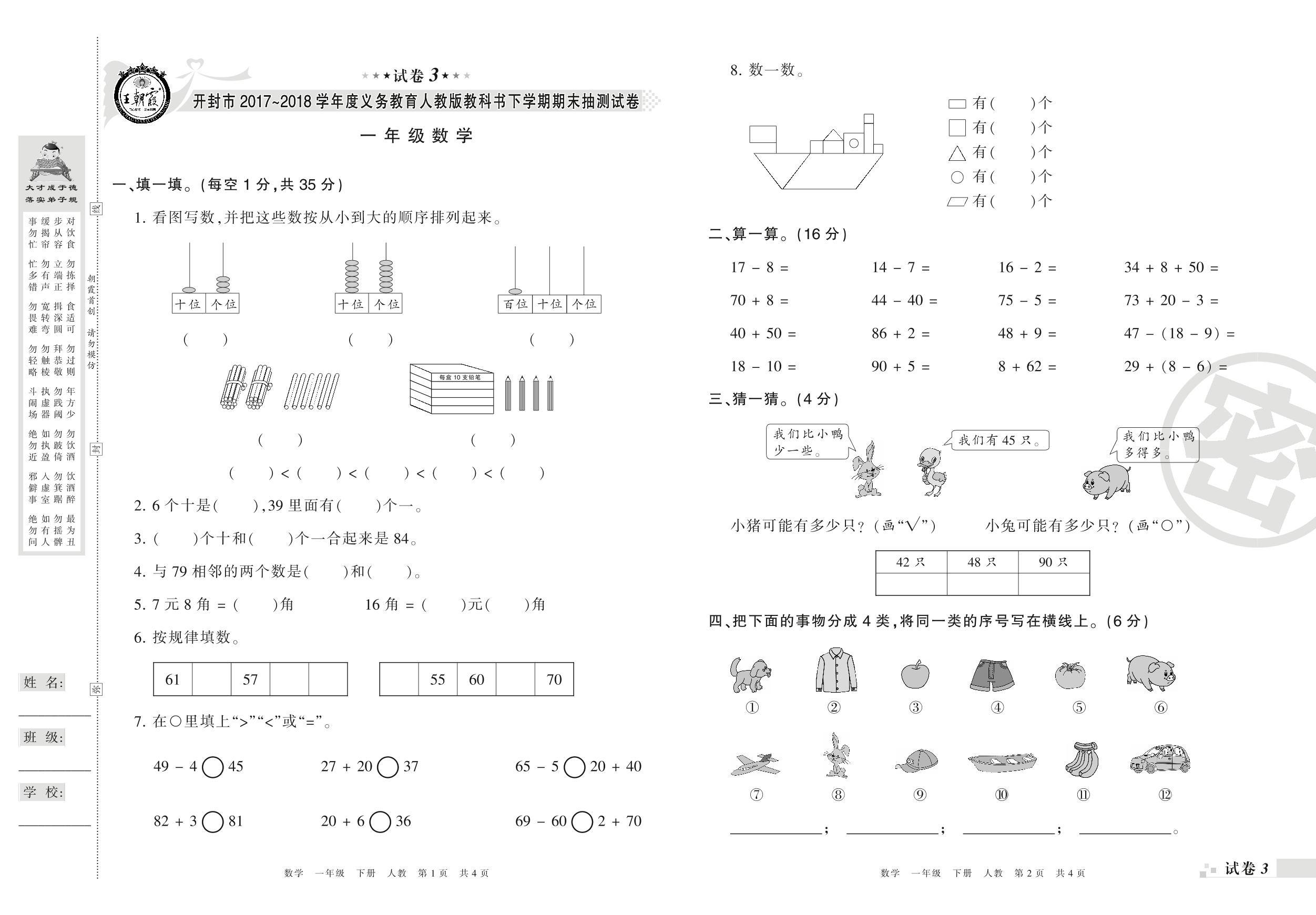 2017-2018学年第二学期开封市一年级数学试卷(人教版)【3】