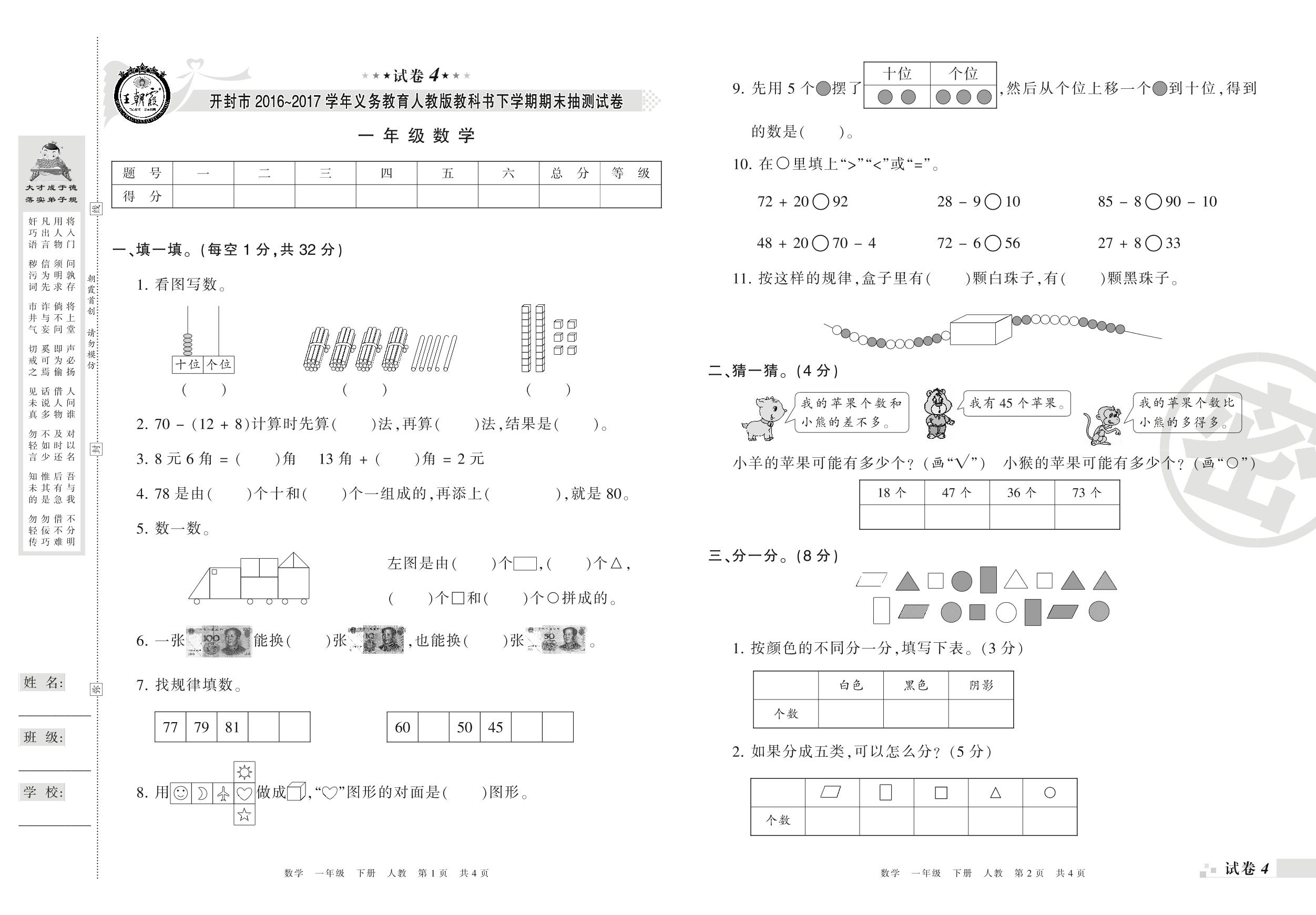 2016-2017学年第二学期开封市一年级数学试卷(人教版)【4】