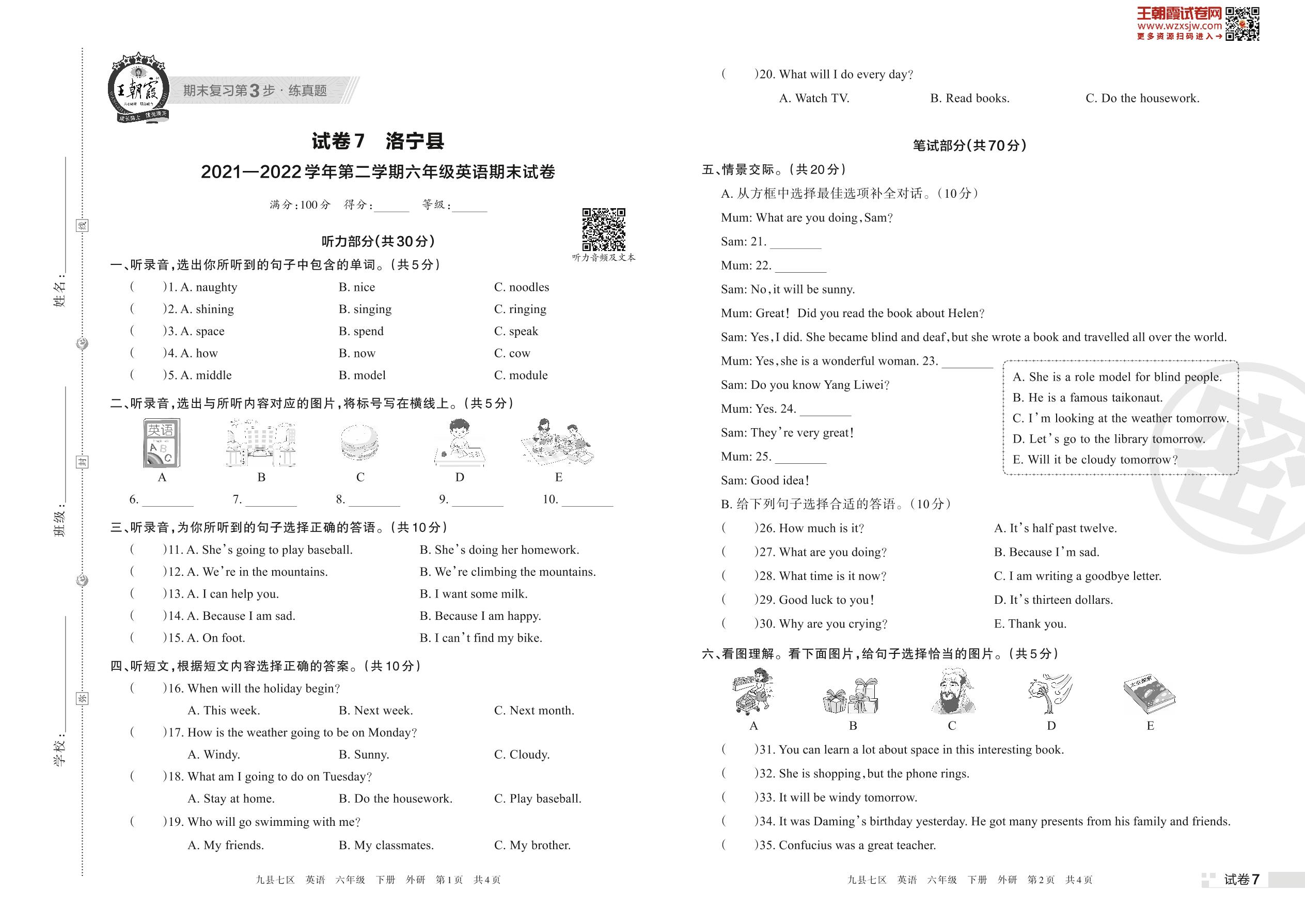 洛宁县2021—2022学年第二学期六年级英语期末试卷(外研版)【7】