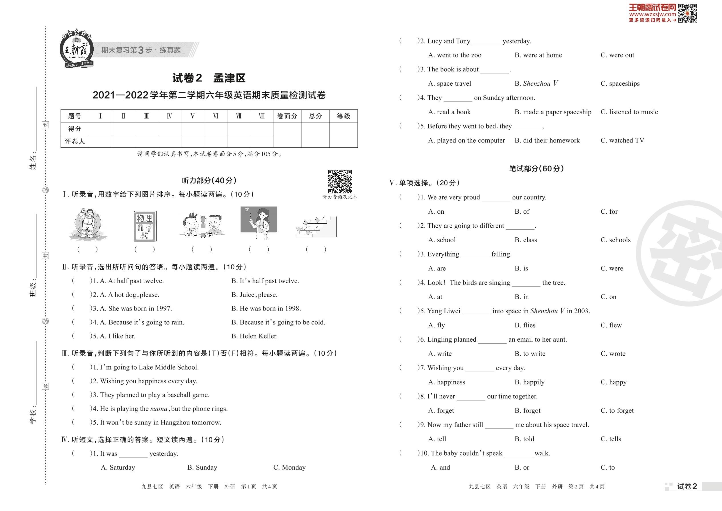 孟津区2021—2022学年第二学期六年级英语期末质量检测试卷(外研版)【2】