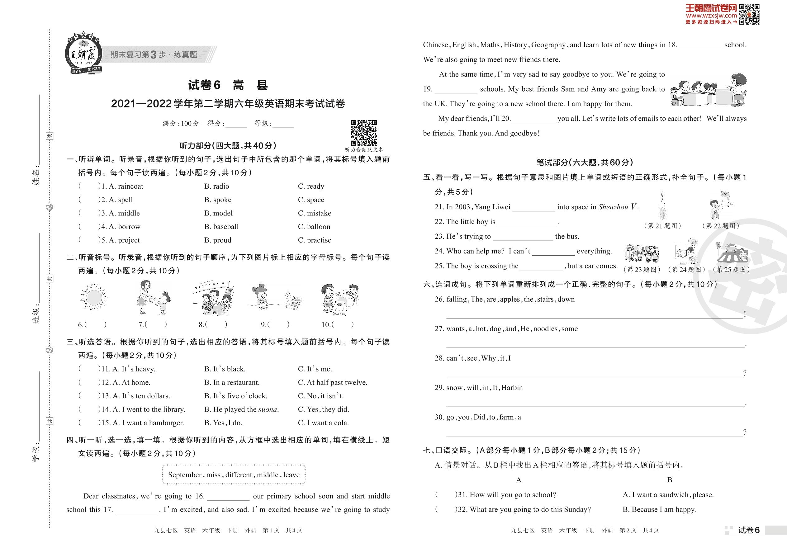 嵩县2021—2022学年第二学期六年级英语期末考试试卷(外研版)【6】