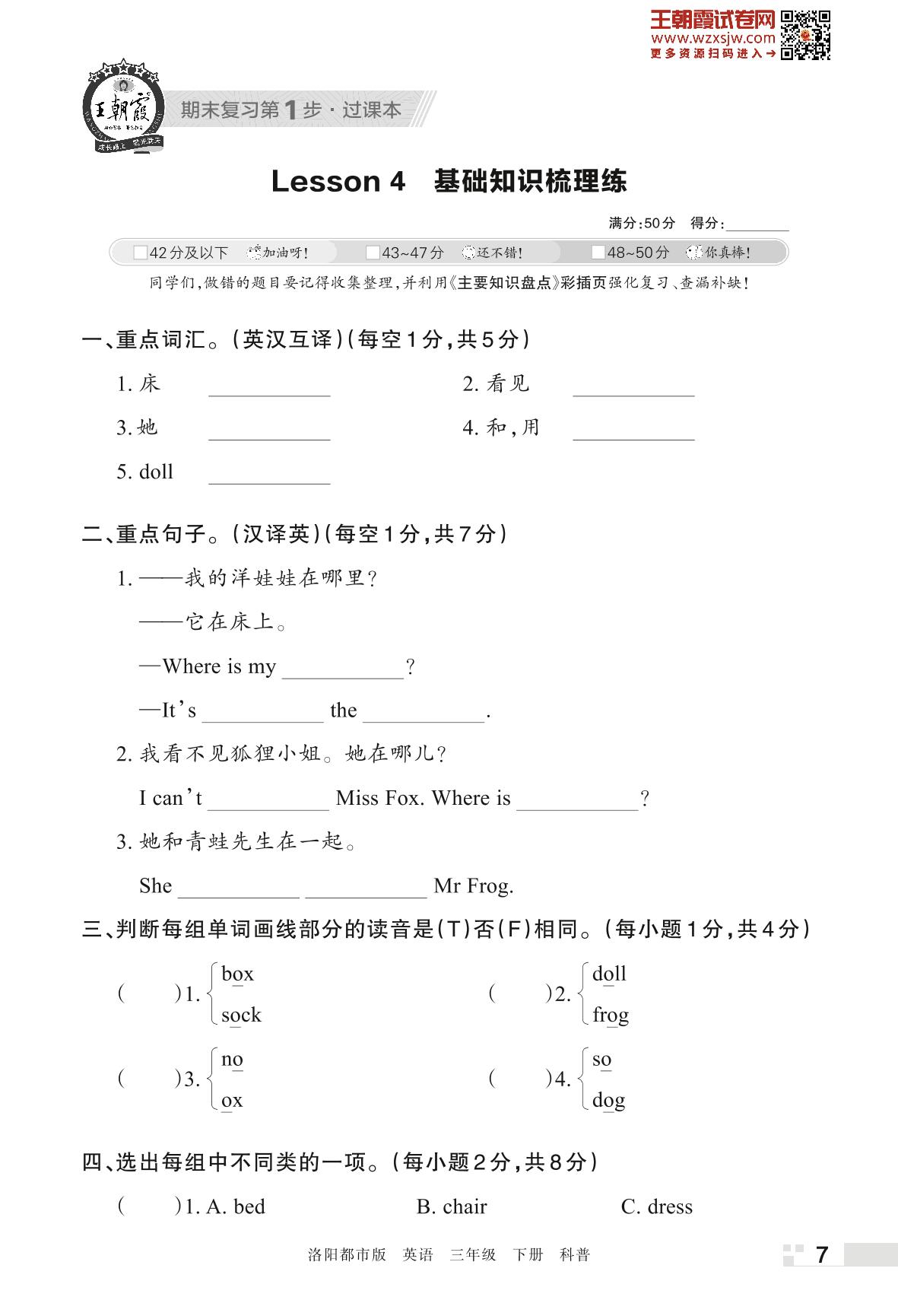 王朝霞期末过课本——Lesson 4 基础知识梳理练三年级下册英语(科普版)_R230425145714649