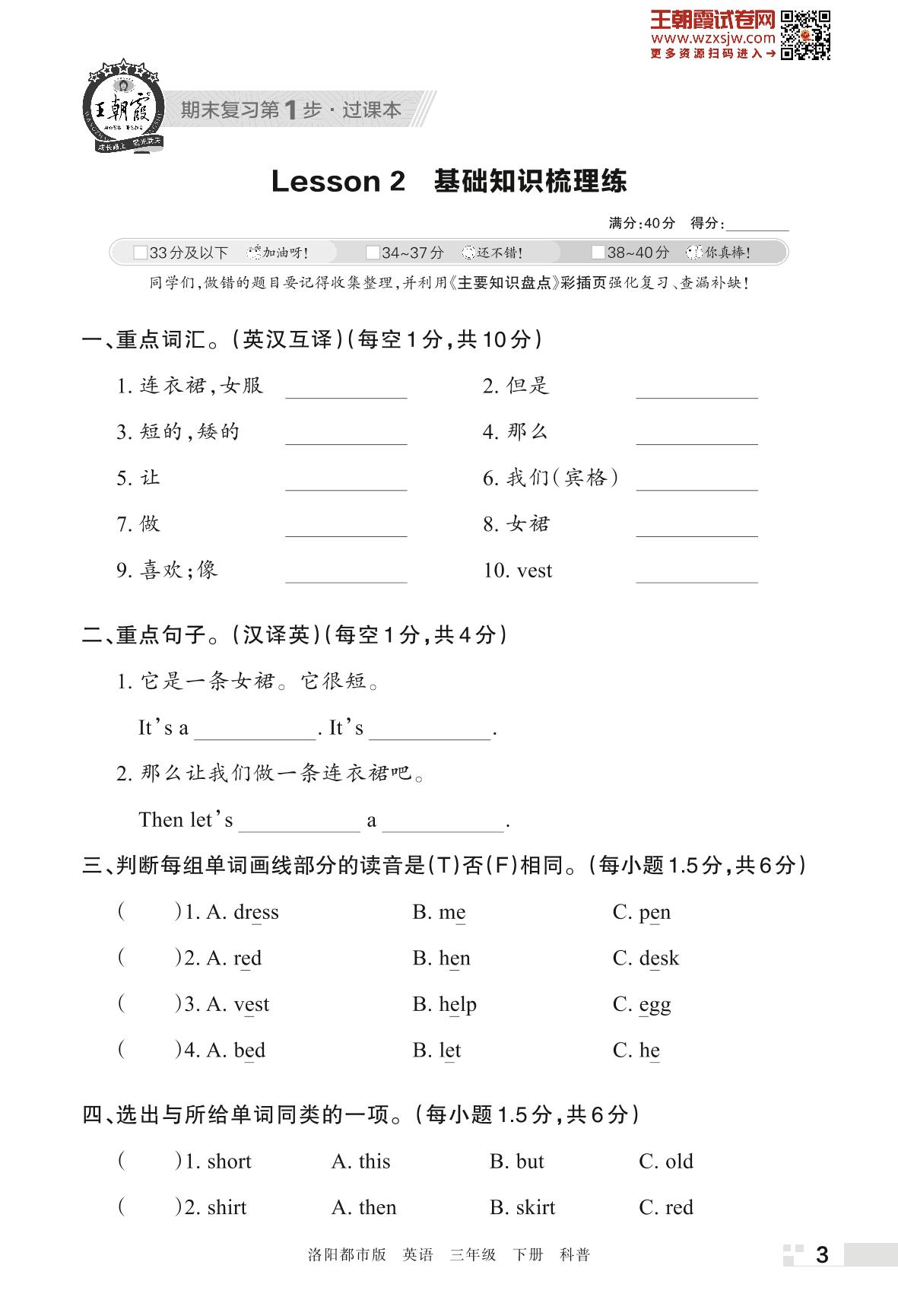 王朝霞期末过课本——Lesson 2 基础知识梳理练三年级下册英语(科普版)_R230425145714963