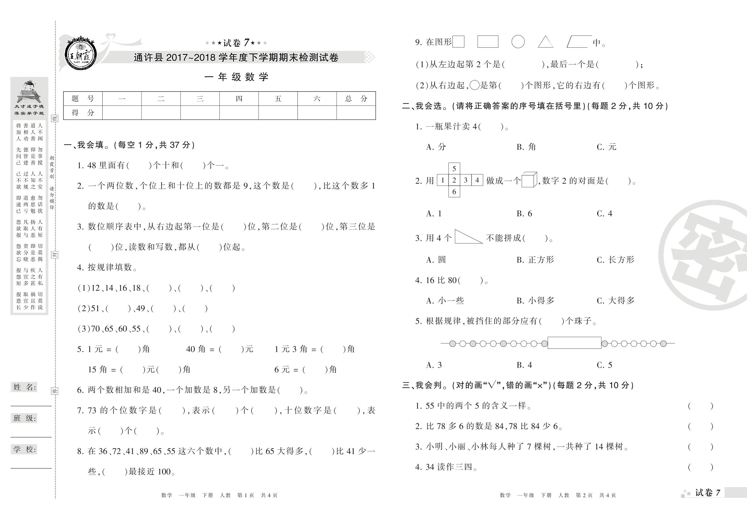 2017-2018学年第二学期开封市通许县一年级数学试卷(人教版)【7】