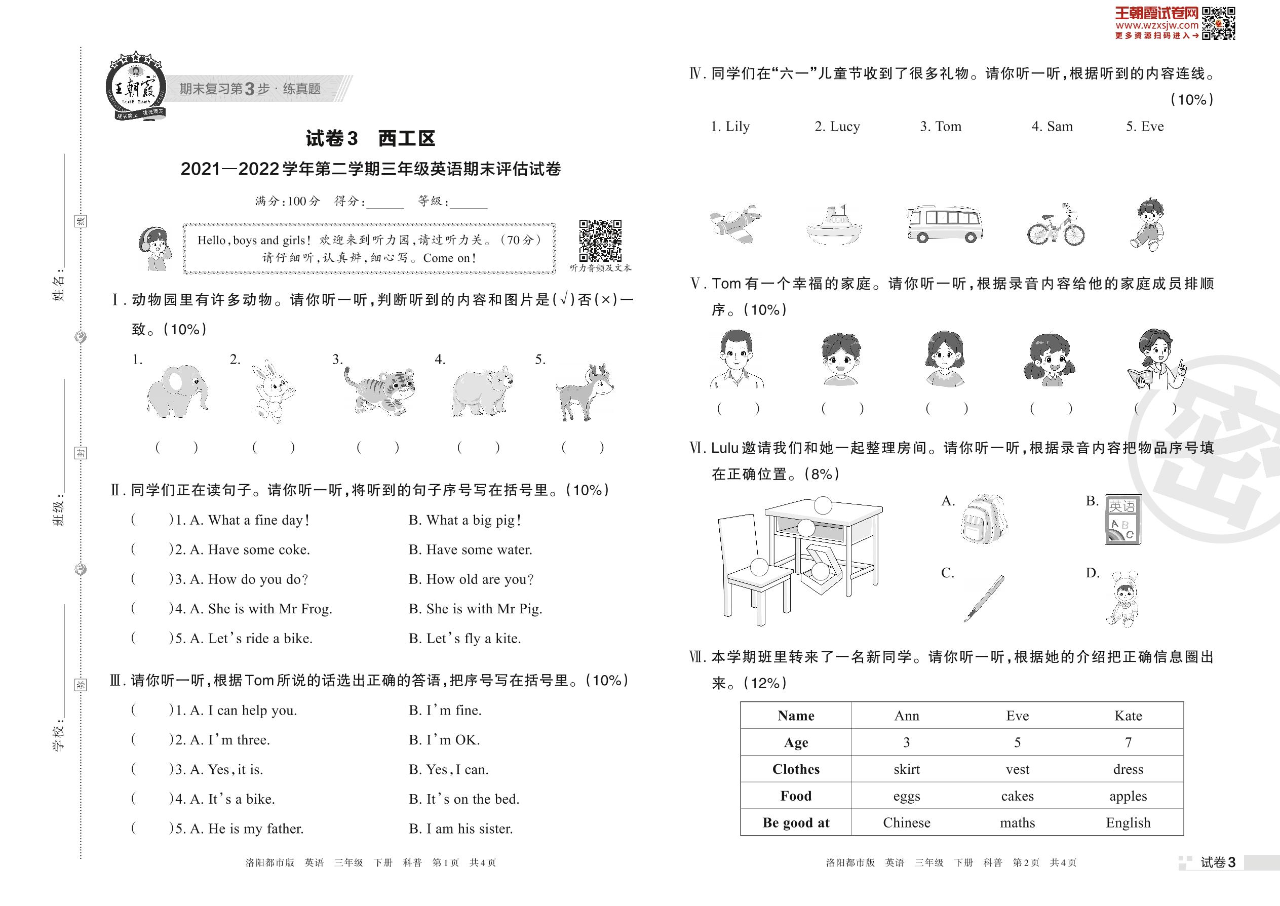 西工区2021—2022学年第二学期三年级英语期末评估试卷(科普版)【3】