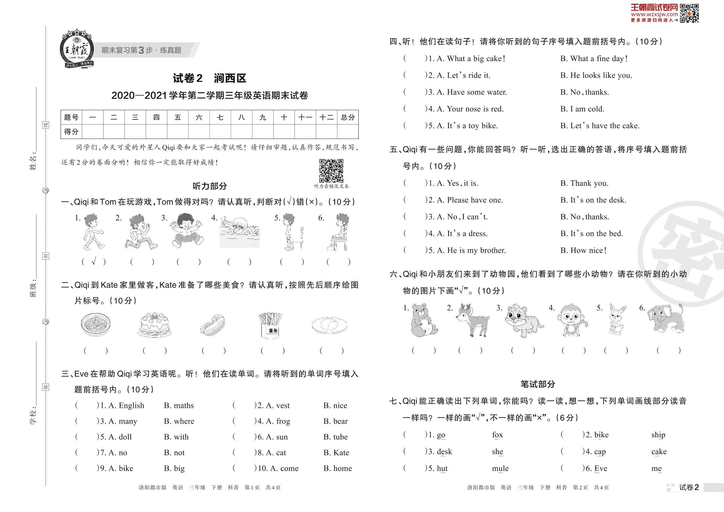涧西区2020—2021学年第二学期三年级英语期末试卷(科普版)【2】