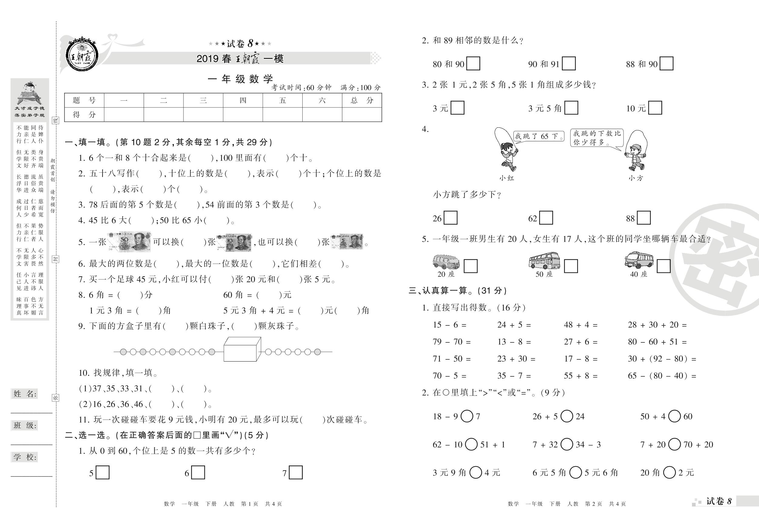 王朝霞期末模拟卷一年级下册数学(人教版)_R210802220737【8】