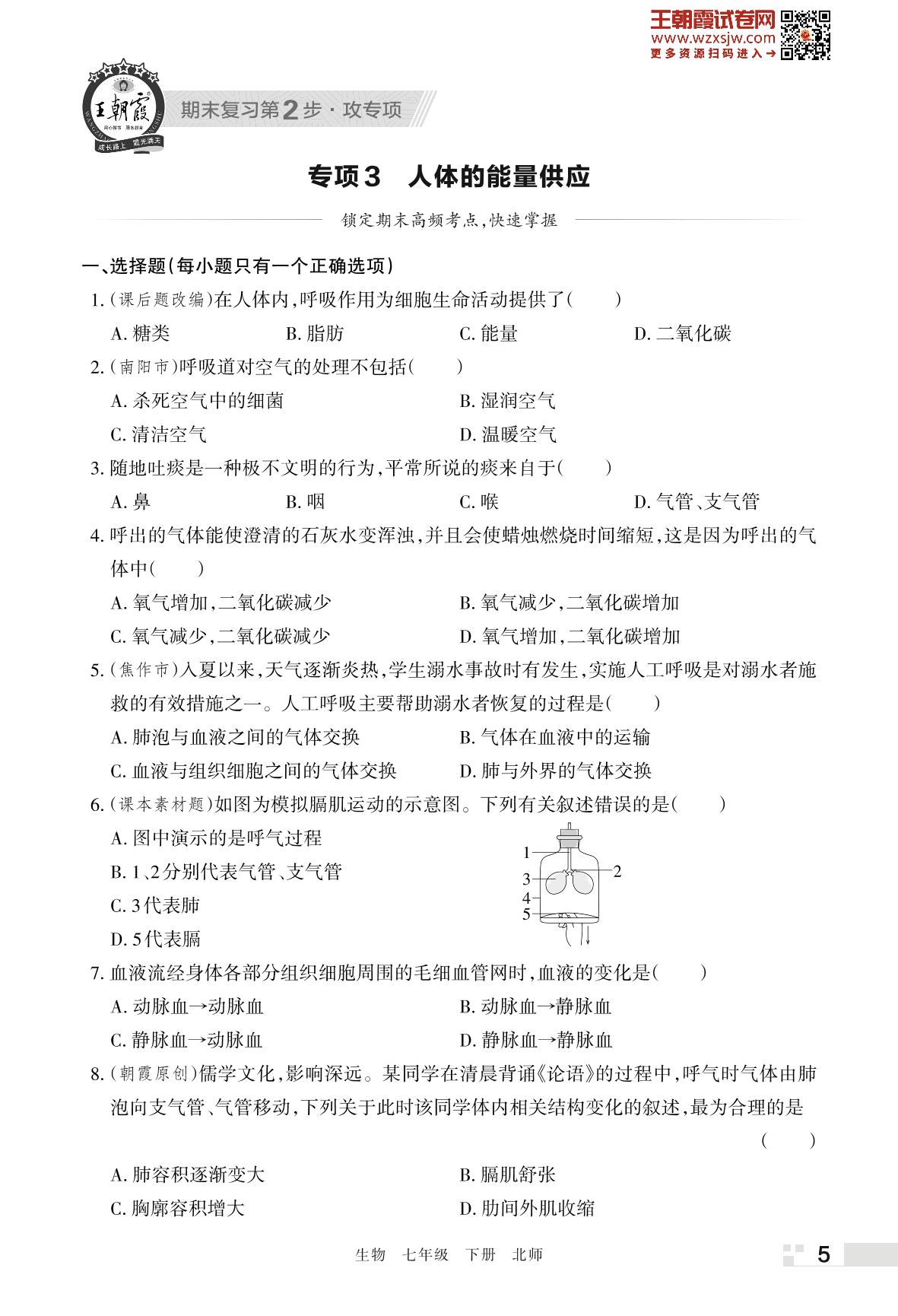 王朝霞期末专项卷——人体的能量供应七年级下册生物(北师版)_R230425150837727【3】