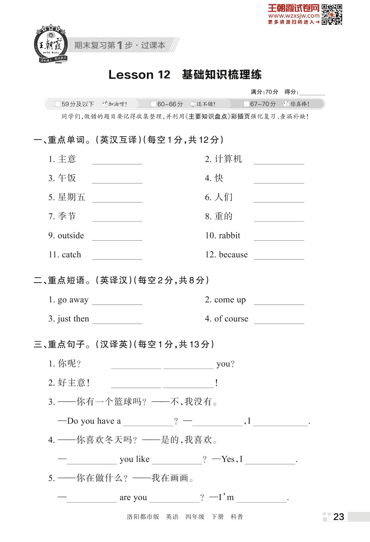 王朝霞期末过课本——Lesson 12 基础知识梳理练四年级下册英语(科普版)_R230425151154320