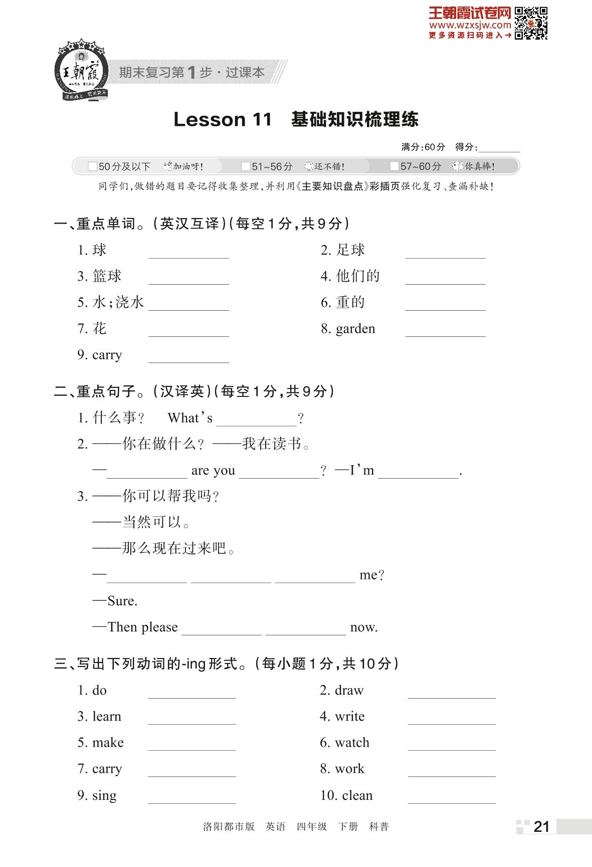 王朝霞期末过课本——Lesson 11 基础知识梳理练四年级下册英语(科普版)_R230425151155601