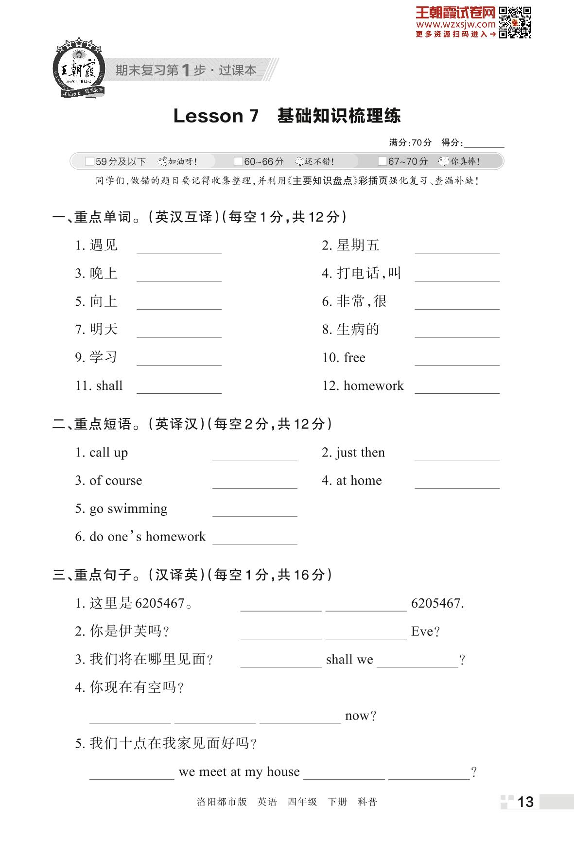 王朝霞期末过课本——Lesson 7 基础知识梳理练四年级下册英语(科普版)_R230425151155552
