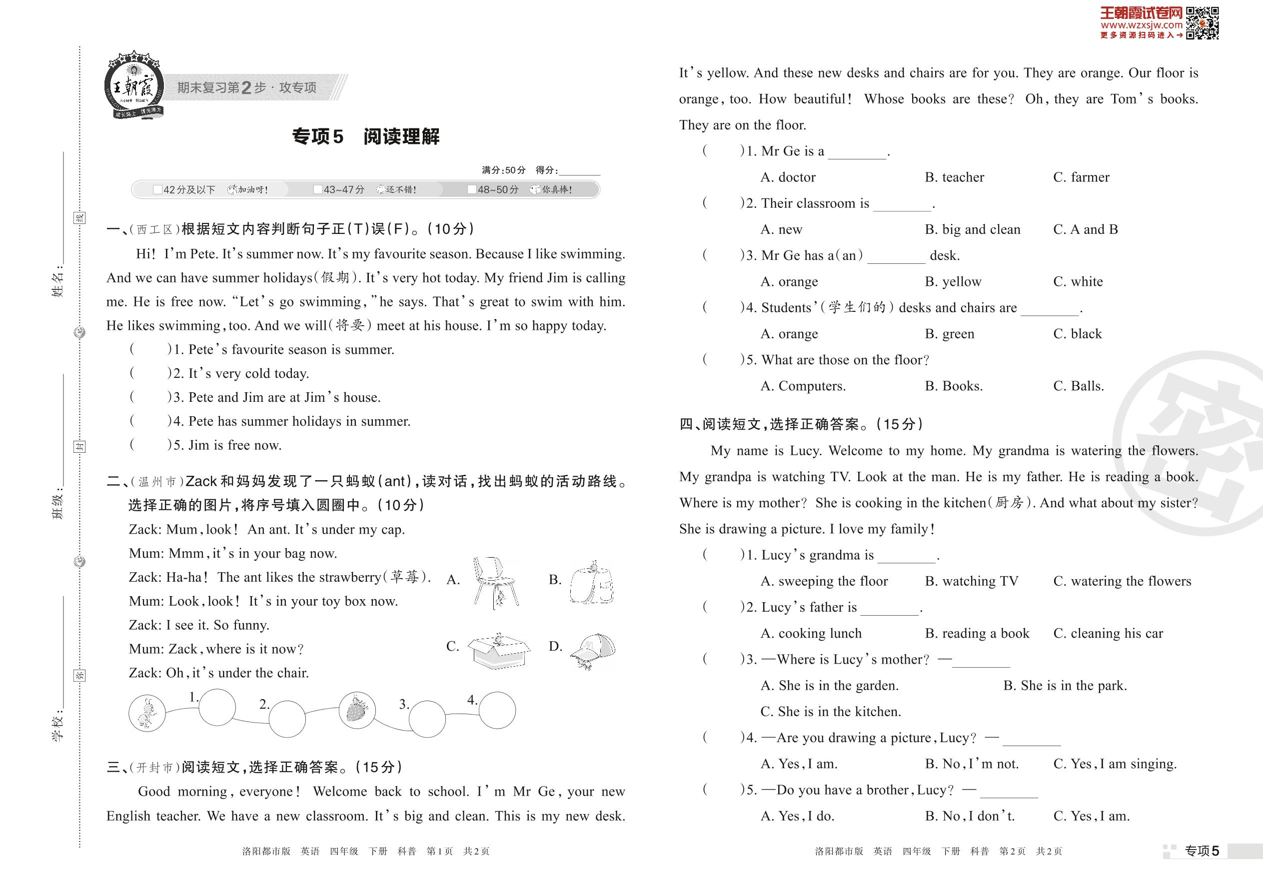 王朝霞期末专项卷——阅读理解四年级下册英语(科普版)_R230425151156849【5】