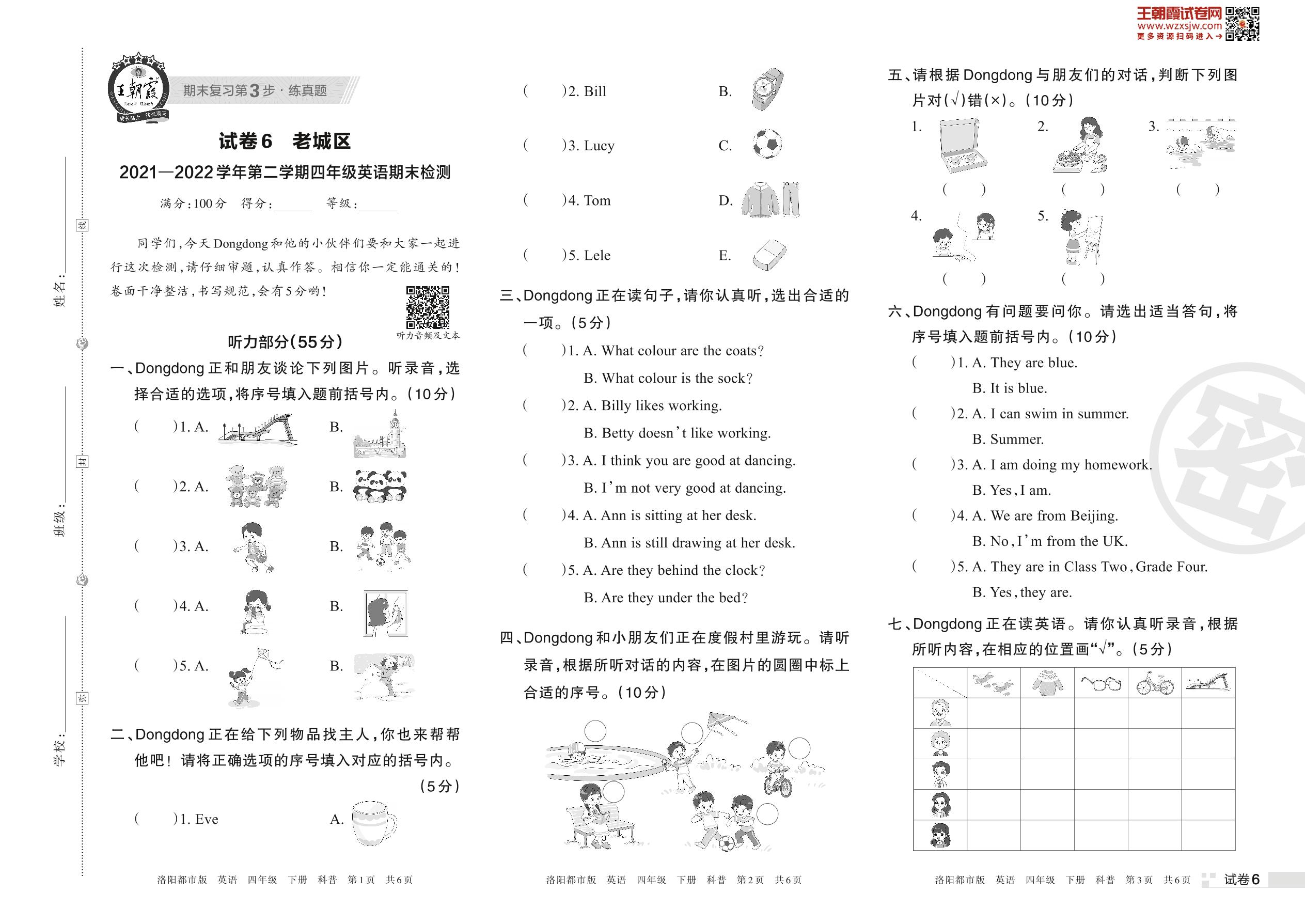 老城区2021—2022学年第二学期四年级英语期末检测(科普版)【6】