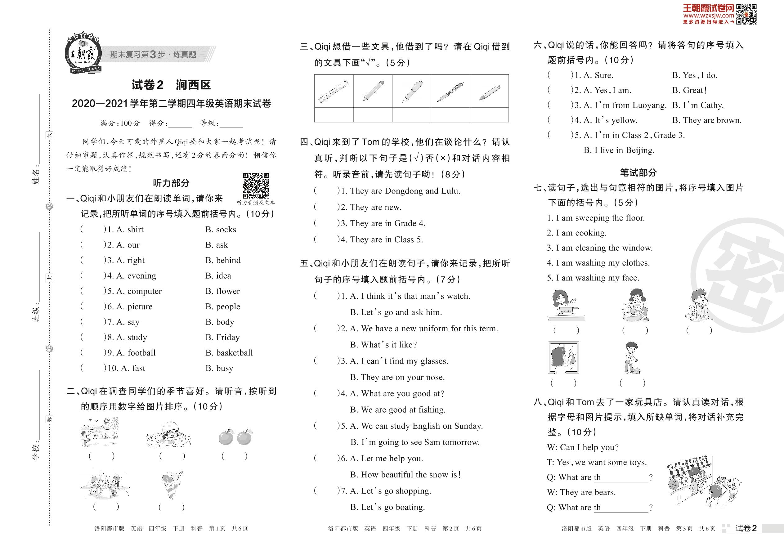 涧西区2020—2021学年第二学期四年级英语期末试卷(科普版)【2】