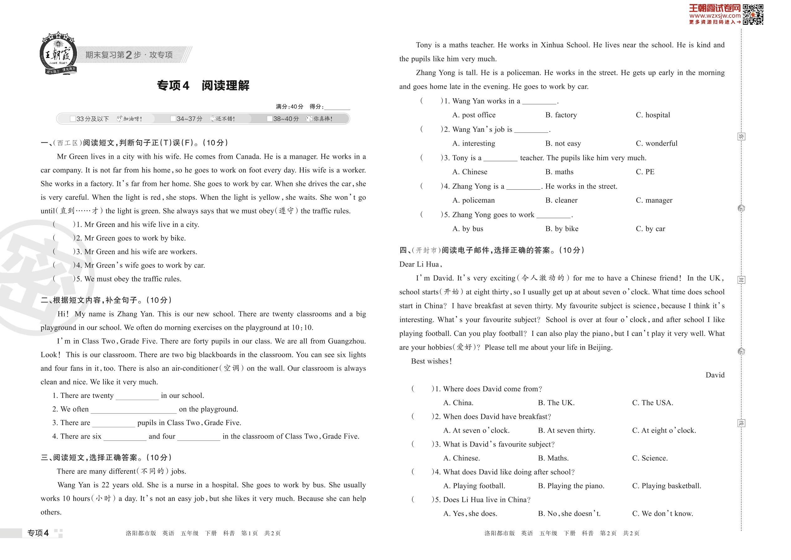 王朝霞期末专项卷——阅读理解五年级下册英语(科普版)【4】