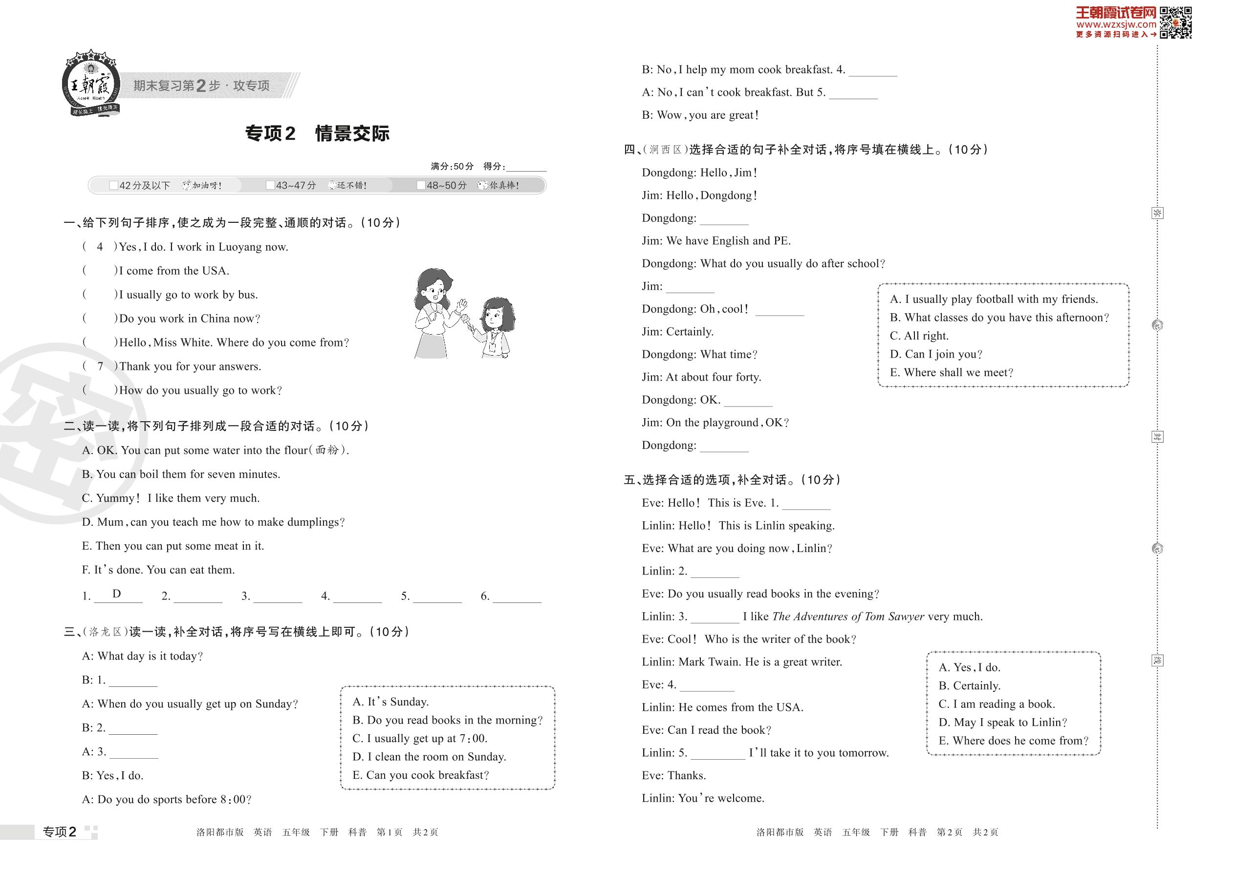 王朝霞期末专项卷——情景交际五年级下册英语(科普版)_R230425152350700【2】
