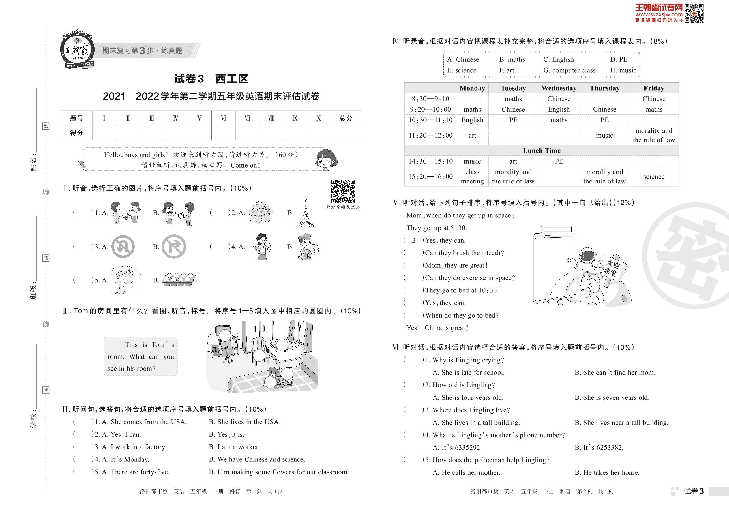 西工区2021—2022学年第二学期五年级英语期末评估试卷(科普版)【3】