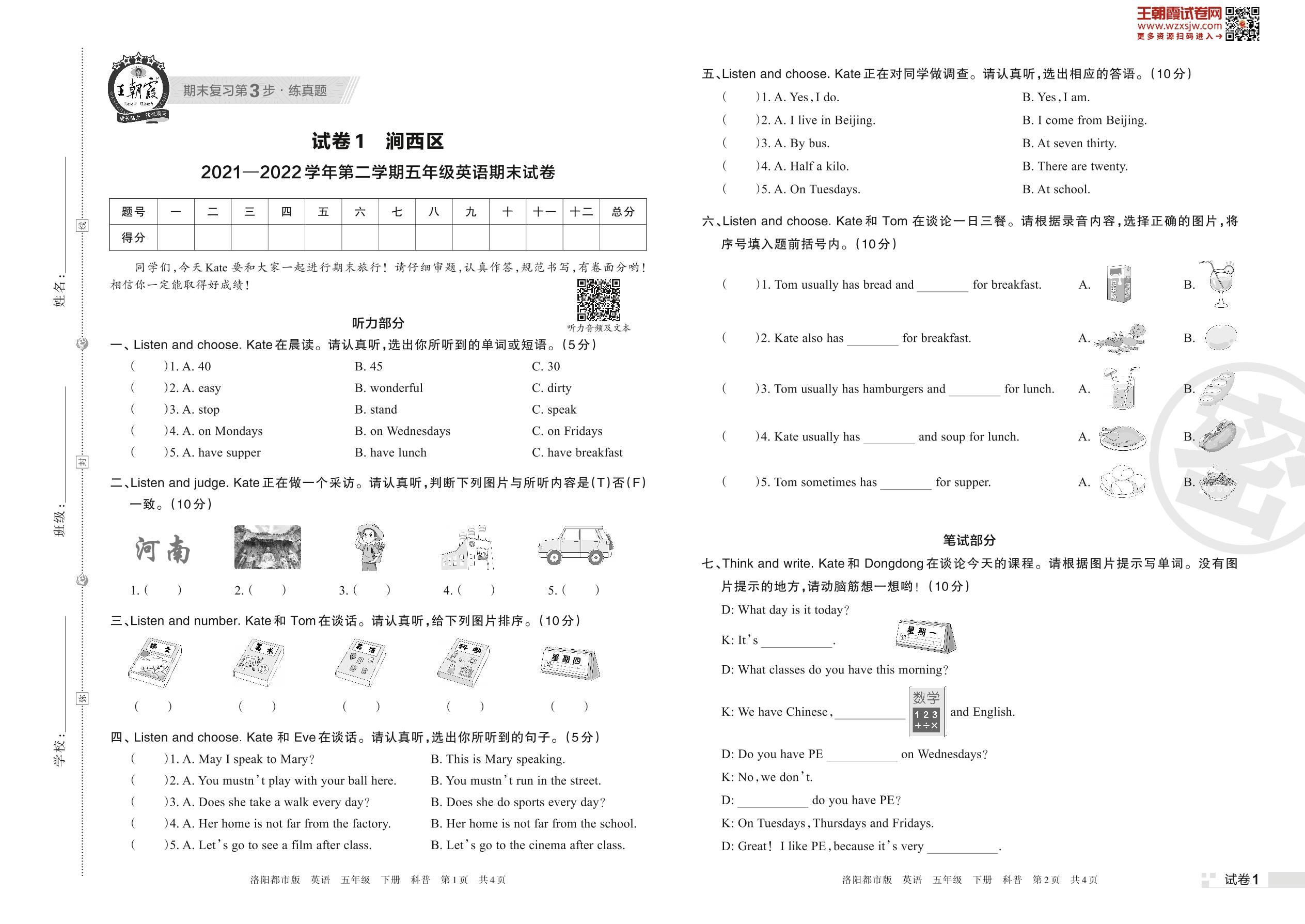 涧西区2021—2022学年第二学期五年级英语期末试卷(科普版)【1】
