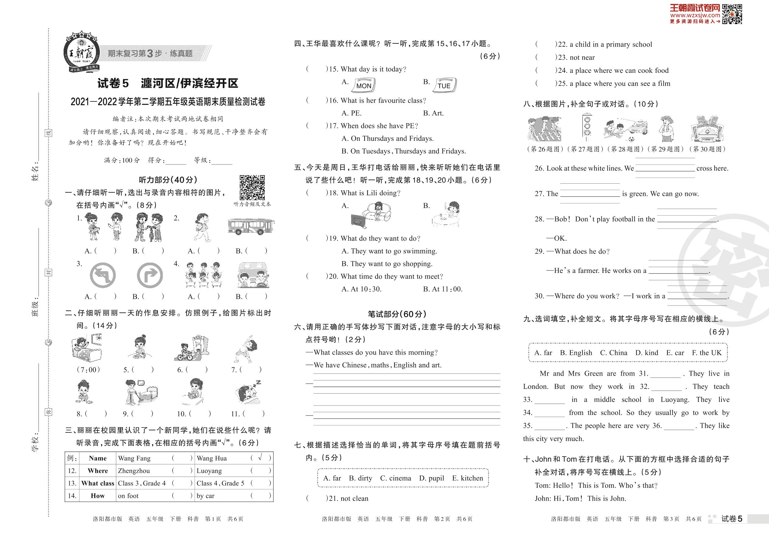 瀍河区、伊滨经开区2021—2022学年第二学期五年级英语期末质量检测试卷(科普版)【5】