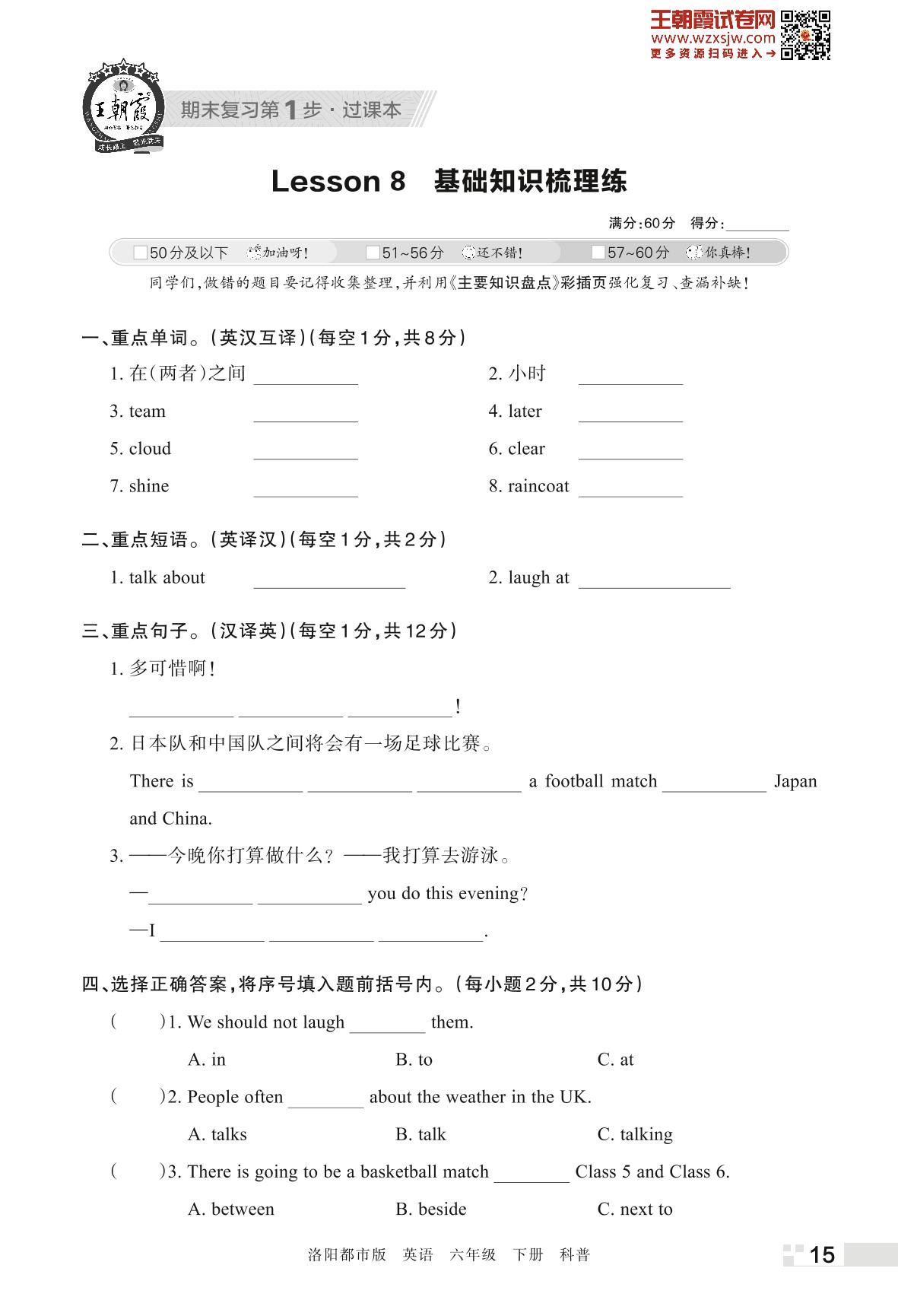 王朝霞期末过课本——Lesson 8 基础知识梳理练六年级下册英语(科普版)_R230425153053636