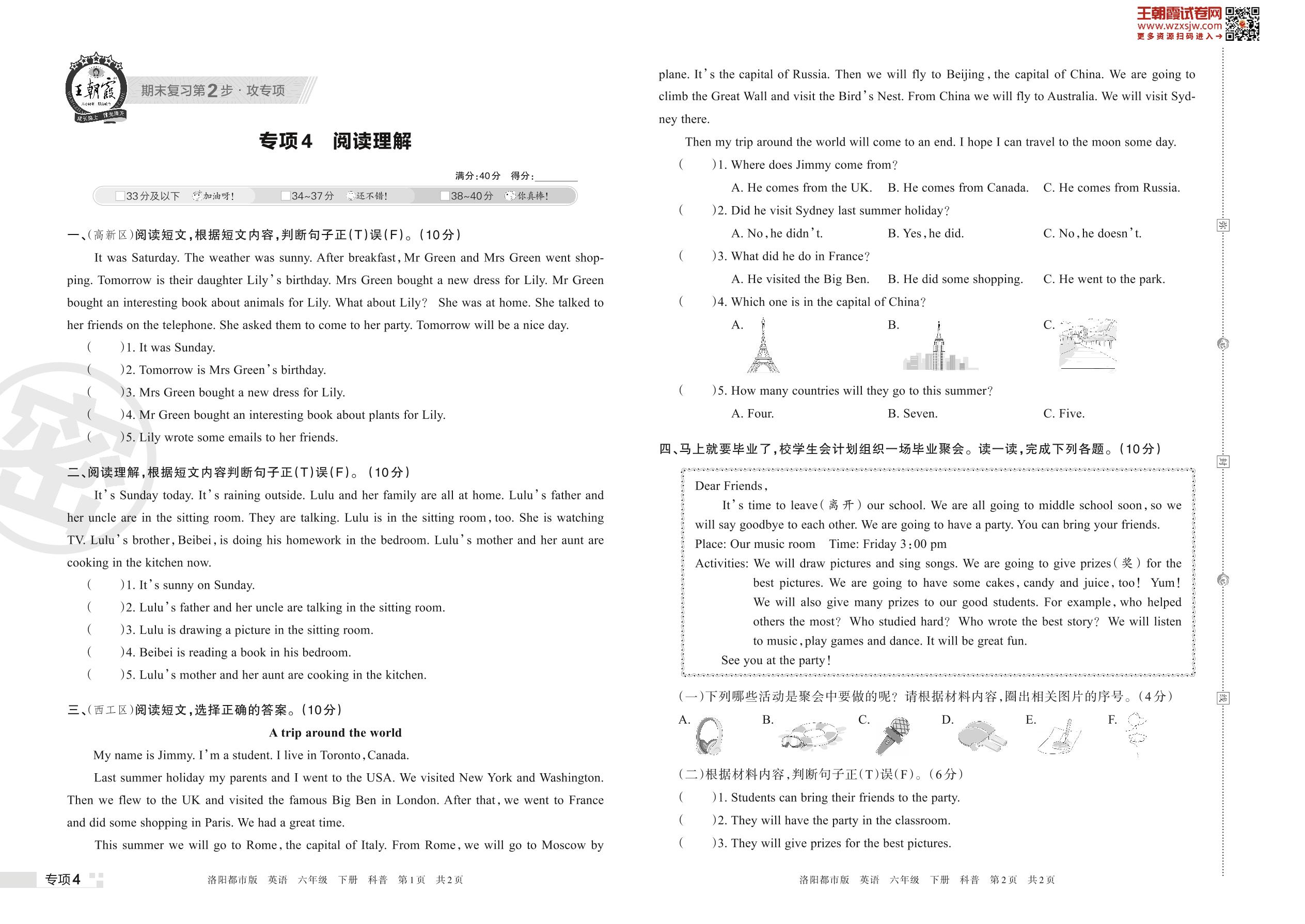 王朝霞期末专项卷——阅读理解六年级下册英语(科普版)_R230425153054899【4】