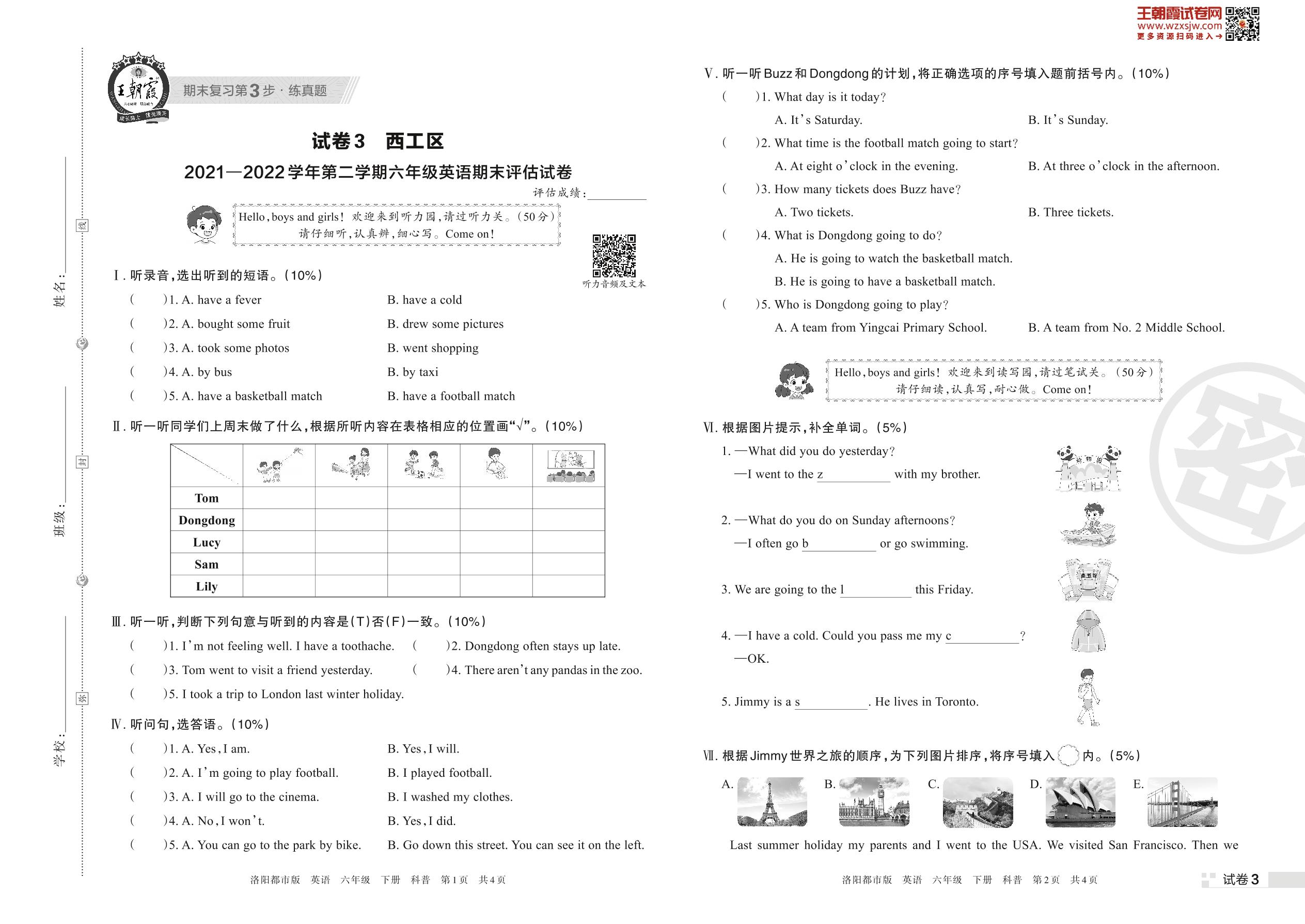 西工区2021—2022学年第二学期六年级英语期末评估试卷(科普版)【3】