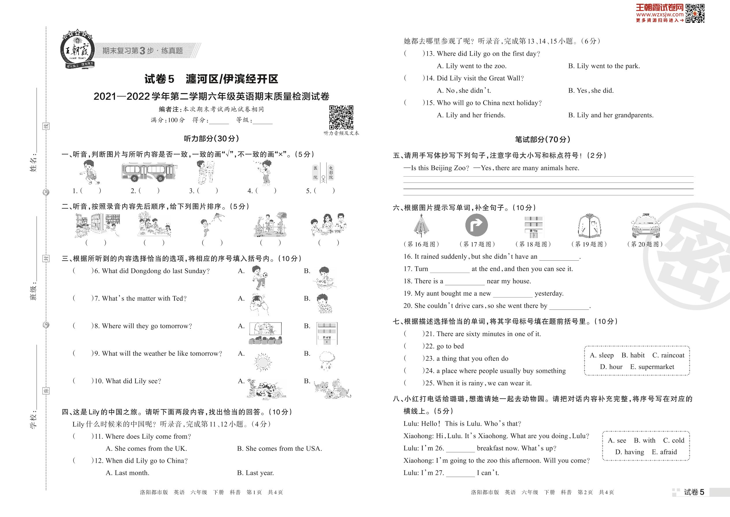 瀍河区、伊滨经开区2021—2022学年第二学期六年级英语期末质量检测试卷(科普版)【5】