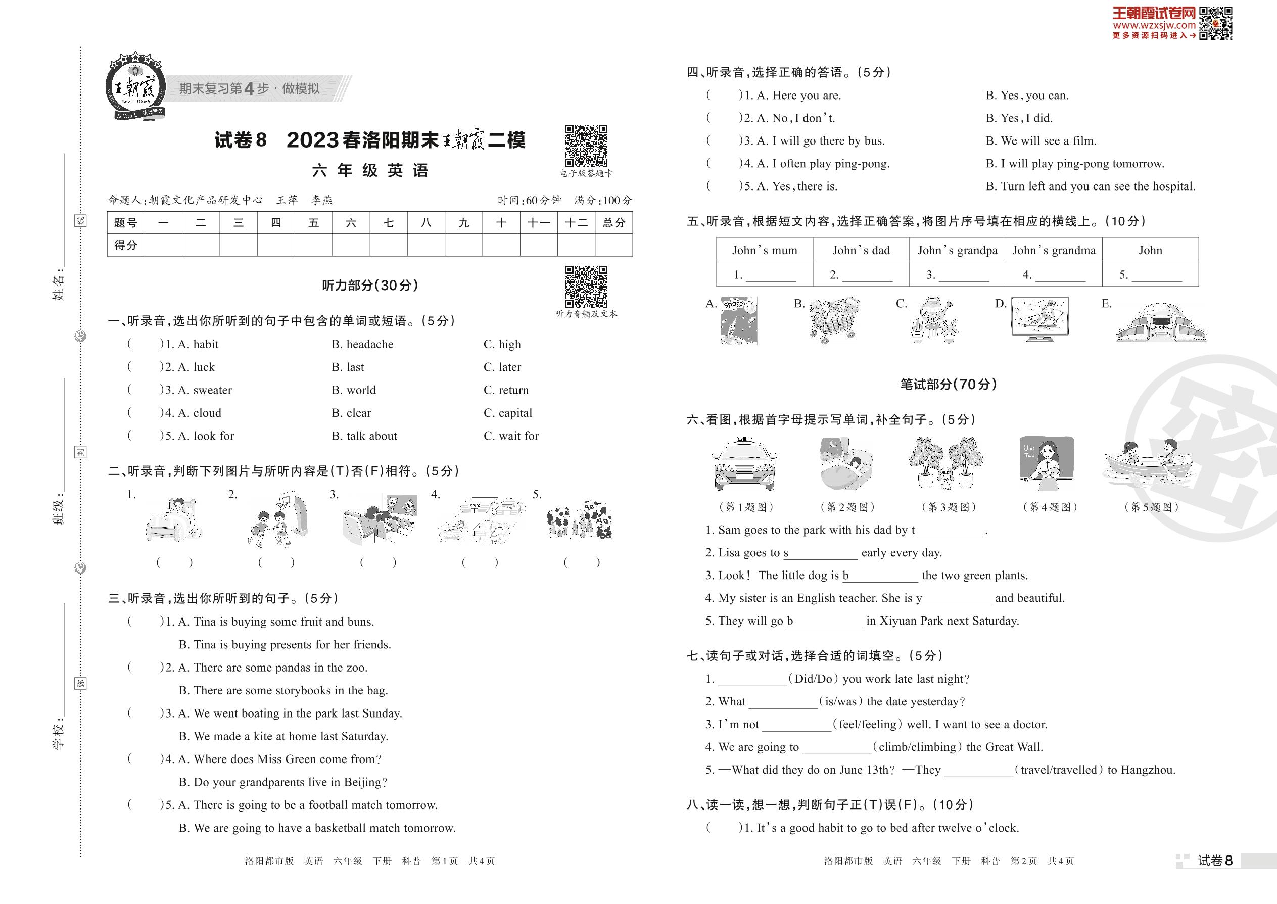 王朝霞期末模拟卷六年级下册英语(科普版)_R230425153055159【8】