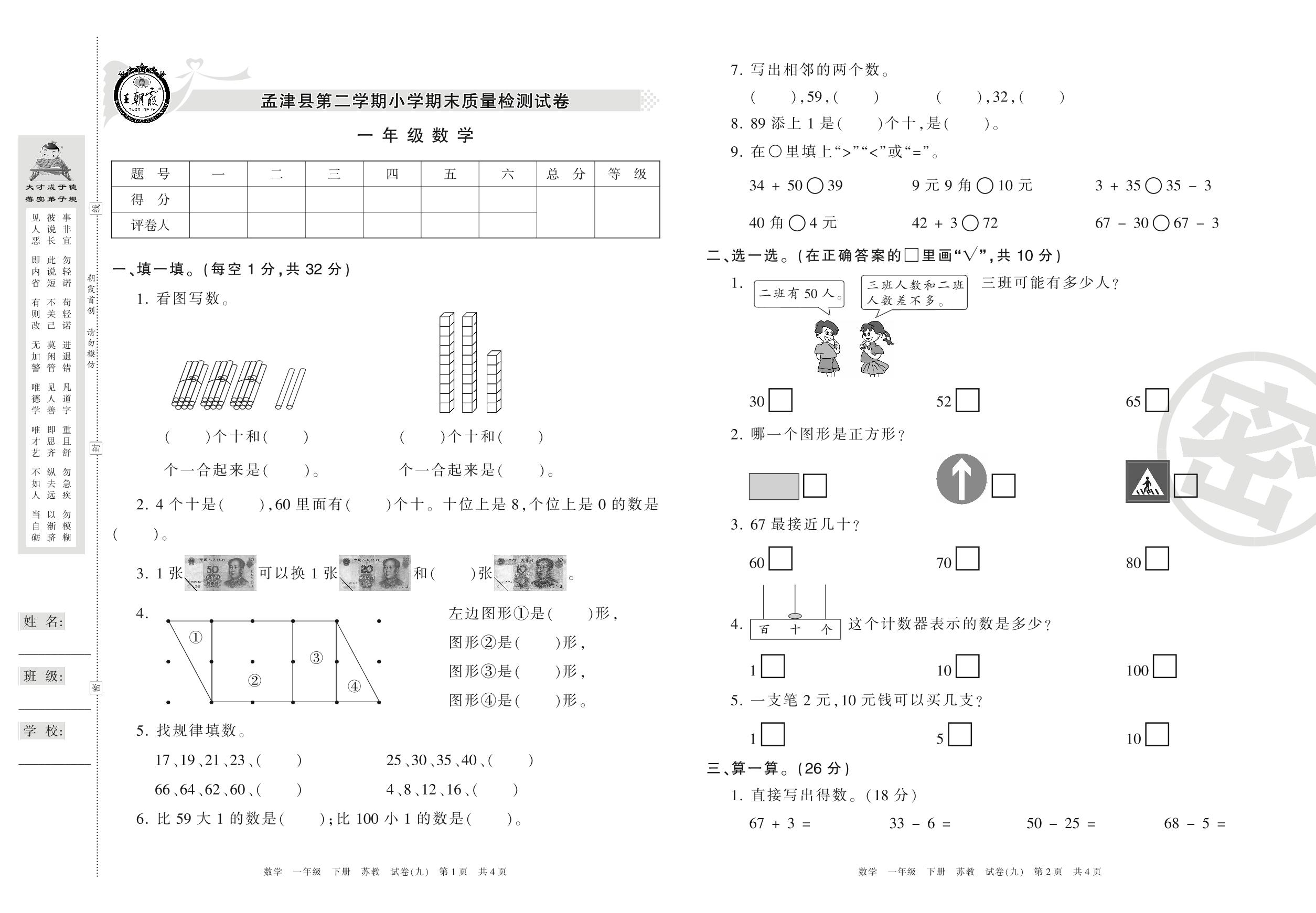 2015-2016学年第二学期洛阳市孟津县一年级数学试卷(苏教版)【9】