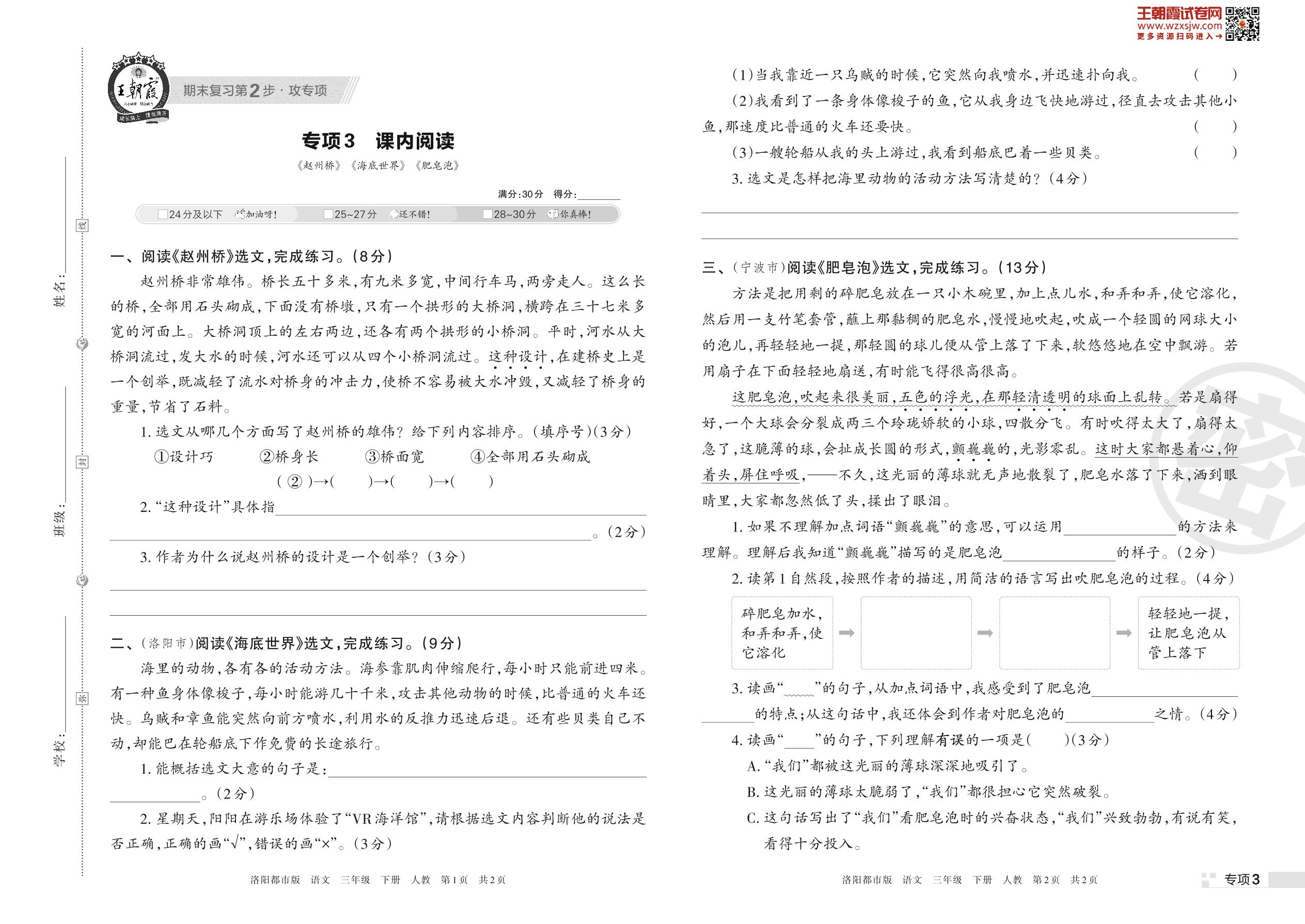 王朝霞期末专项卷——课内阅读三年级下册语文(人教版)_R230425154340317【3】